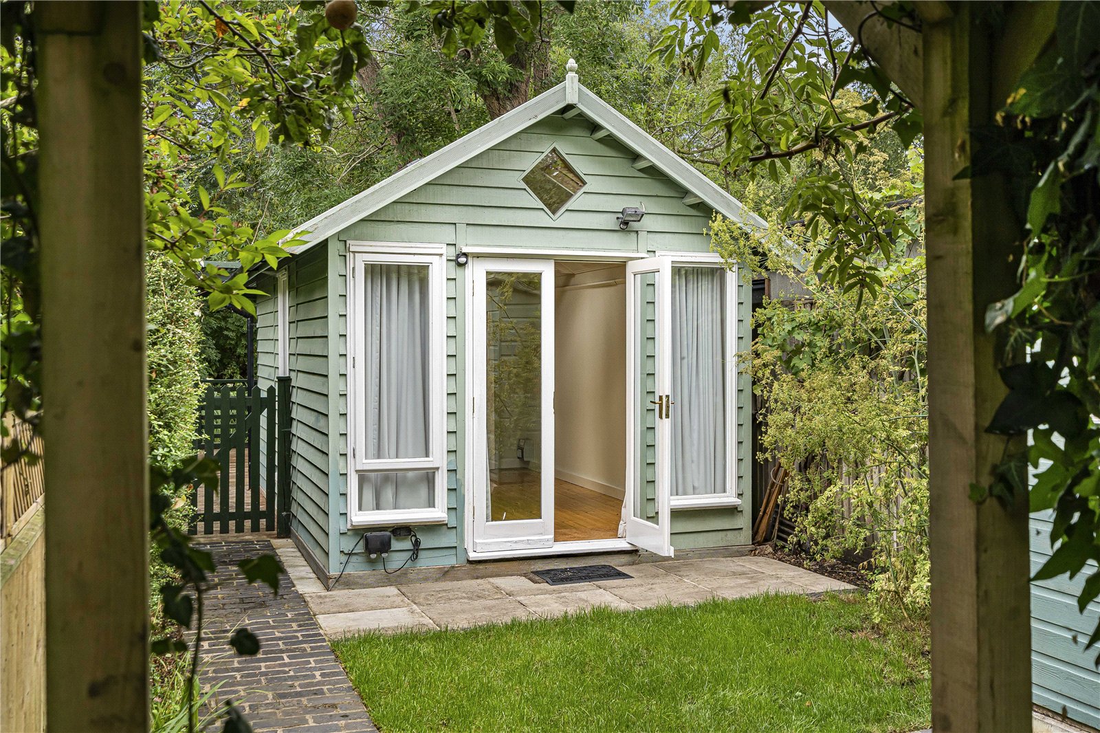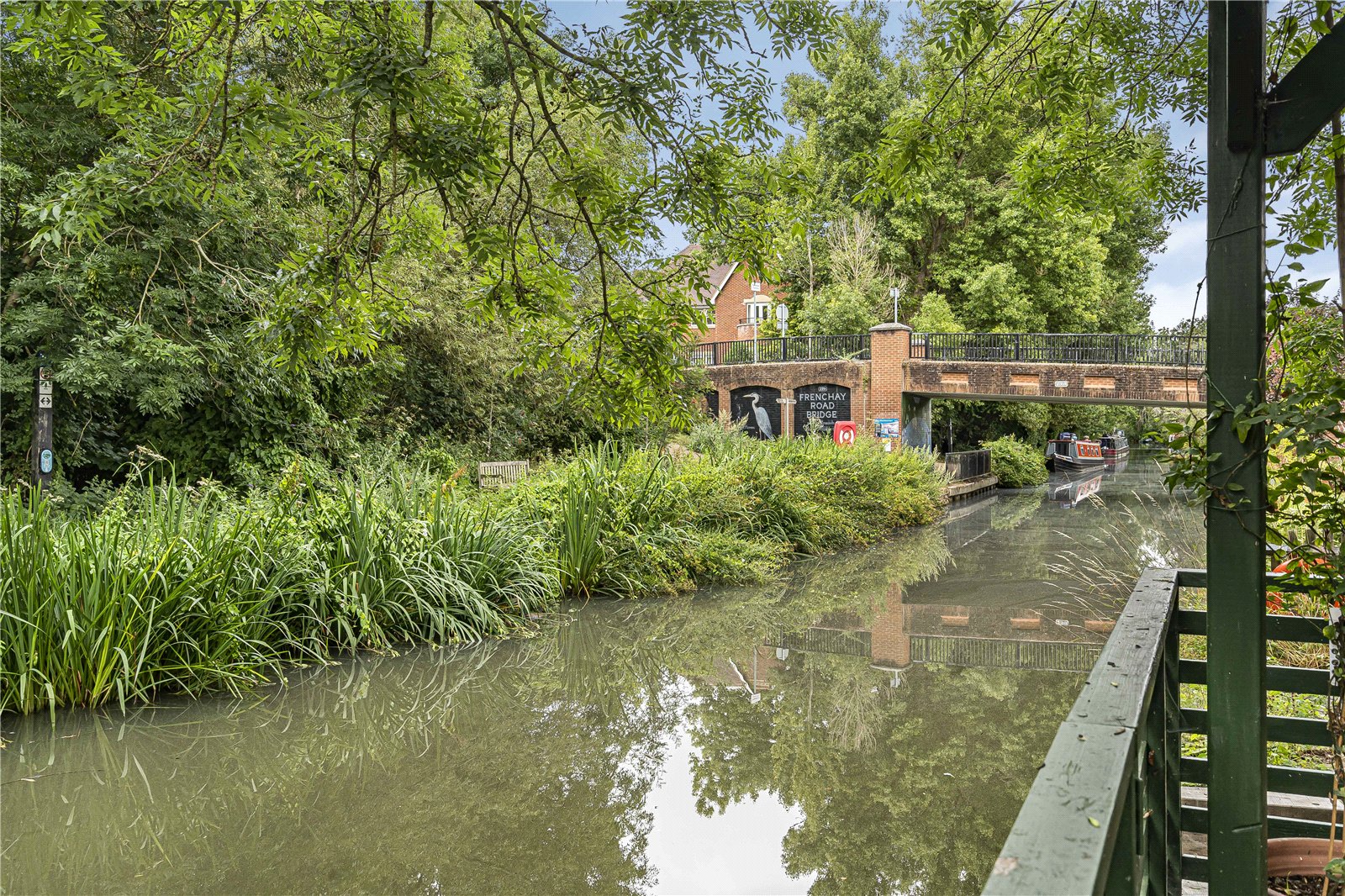 The kitchen backs to a beautiful canal-side garden with a spacious studio, equipped with electricity and heating, which can be used as a home office, studio, gym or additional guest room. To the rear, there is a decked area with a wooden pergola overlooking the canal and the protected nature reserve directly opposite.