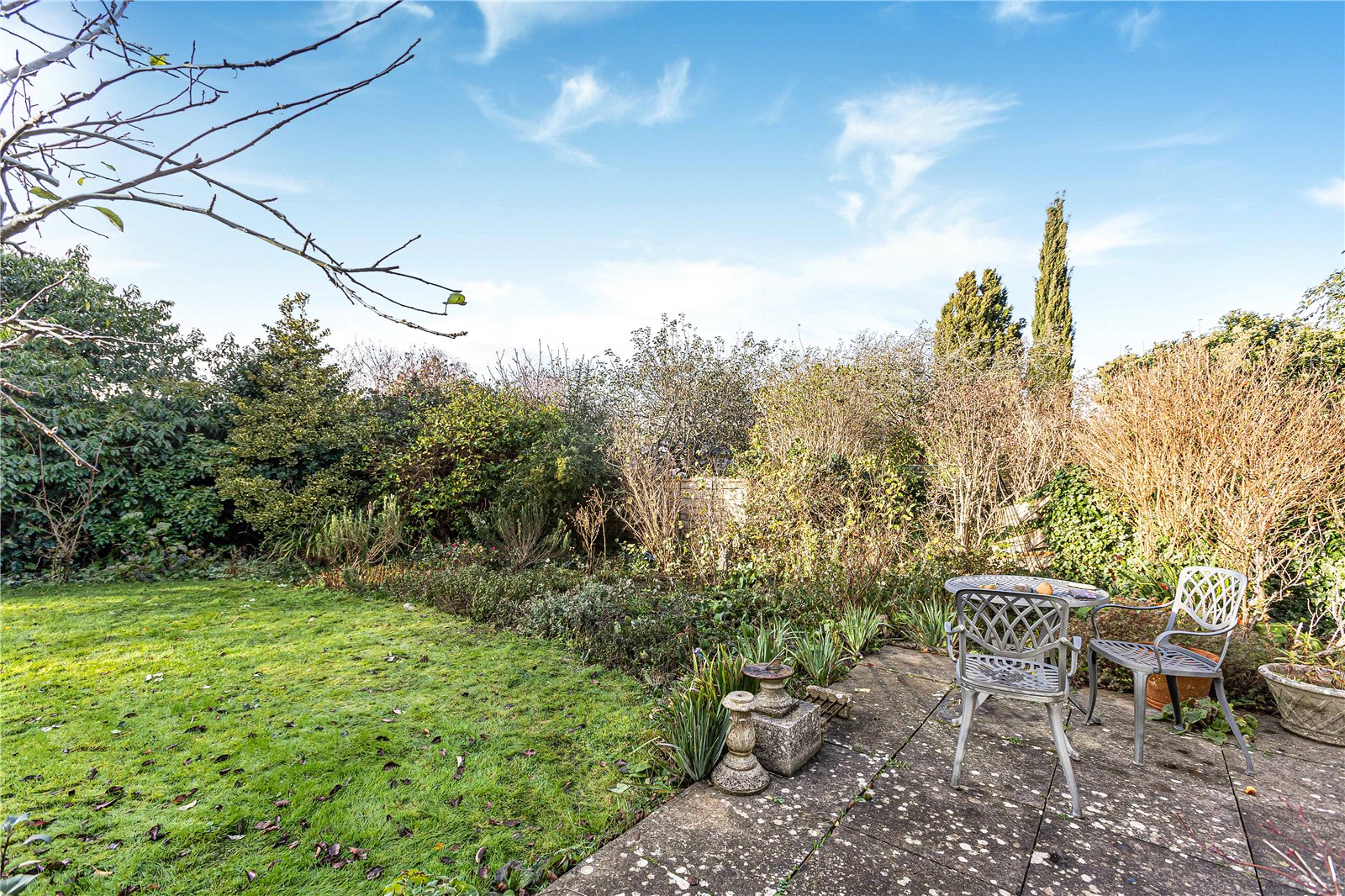 The west-facing rear garden has a paved terrace adjacent to the house, offering the perfect space for al fresco dining in the warmer months. Beyond, the lawn is surrounded by varied planting, mature trees, and shrubs, creating a private and peaceful space.
