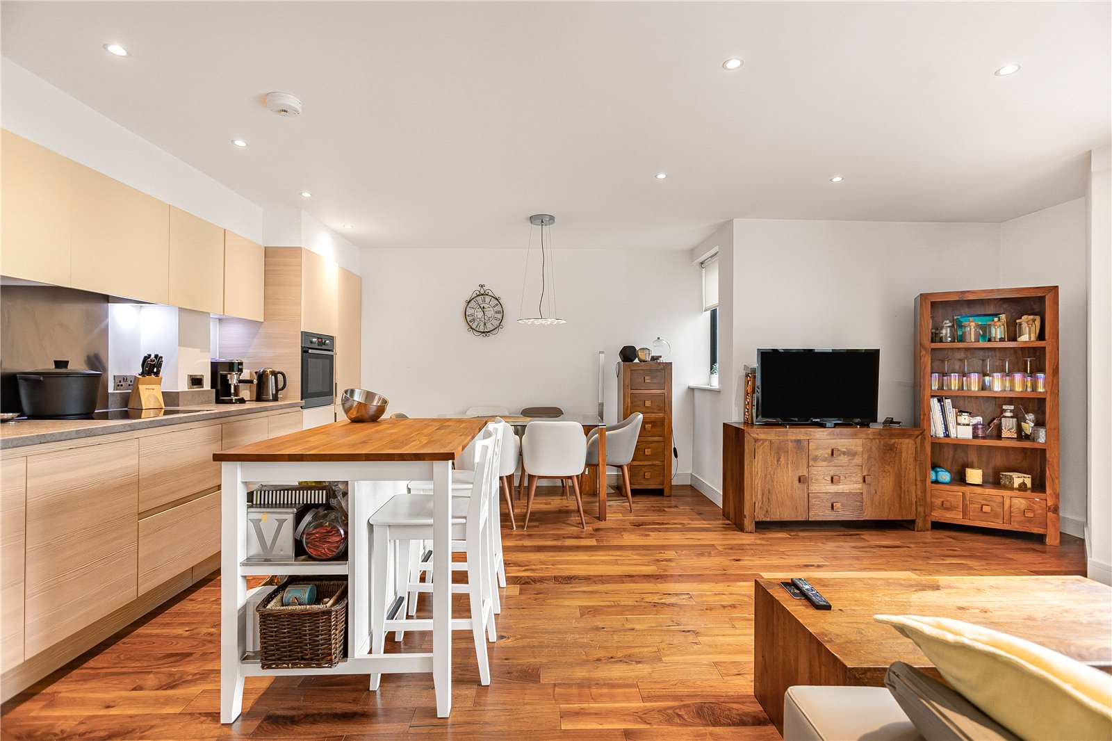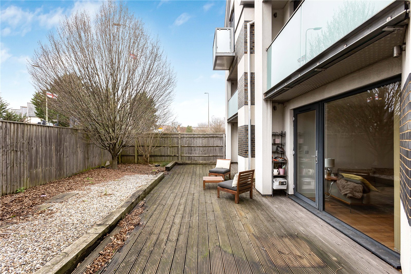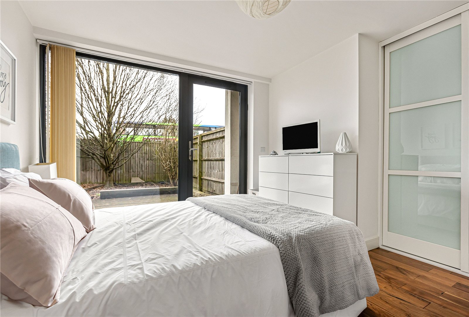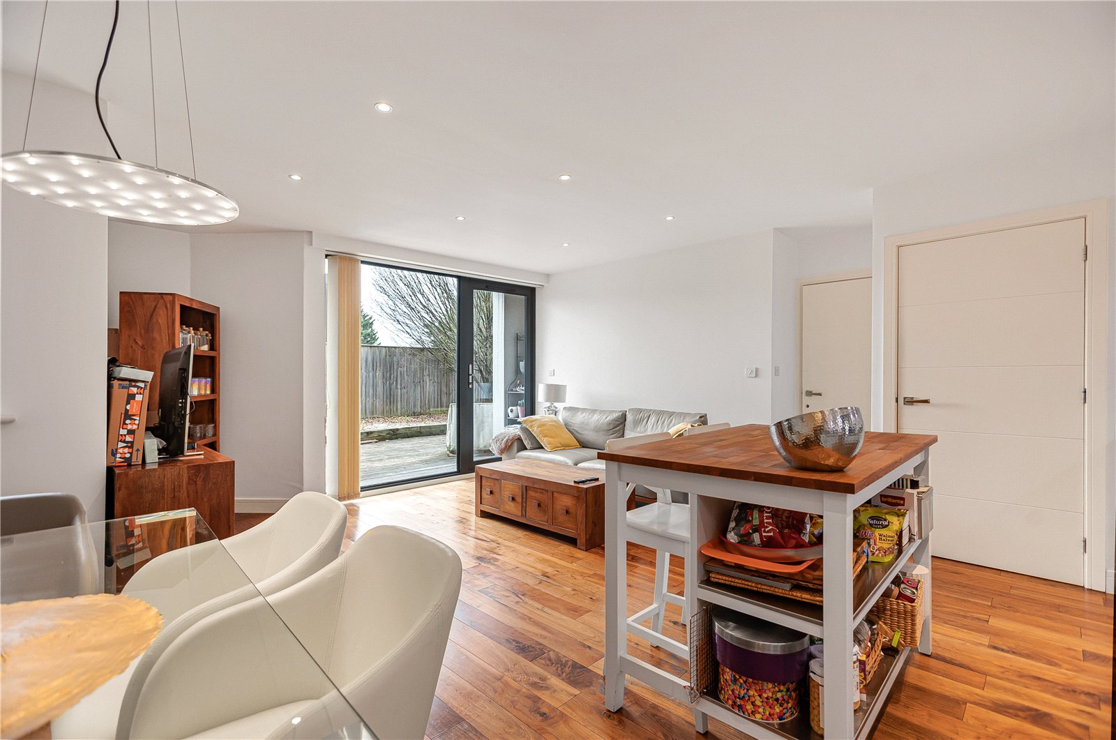 The property features a stylish open-plan kitchen and dining area, complete with floor-to-ceiling bi-fold doors that open directly onto a secluded, south-facing garden, perfect for indoor-outdoor living and entertaining. Underfloor heating runs throughout the apartment, providing comfort and efficiency year-round.