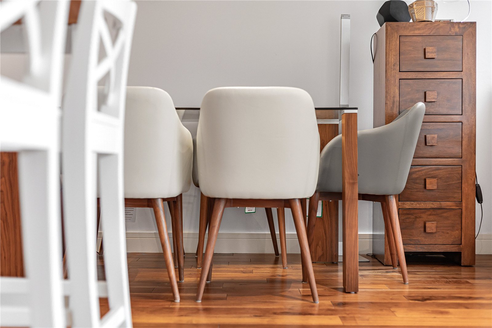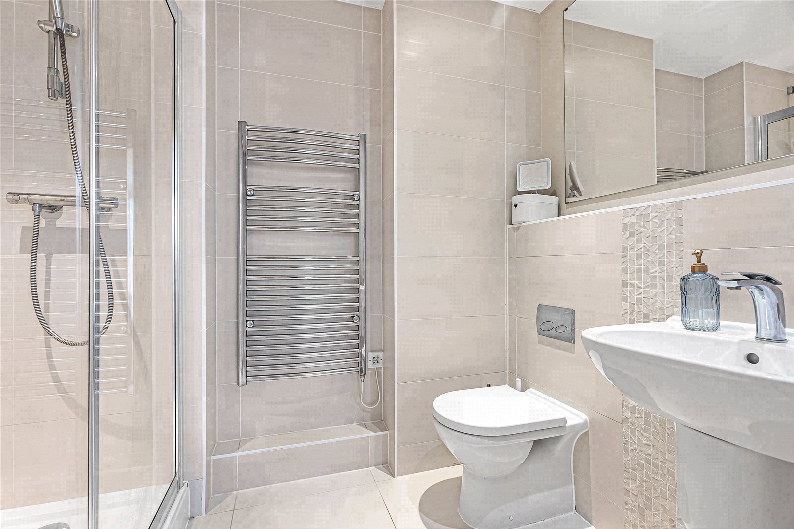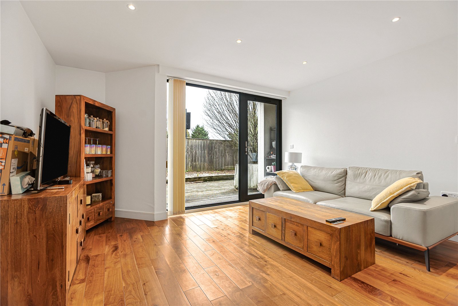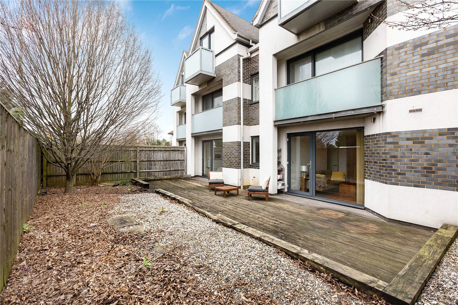 The property features a stylish open-plan kitchen and dining area, complete with floor-to-ceiling bi-fold doors that open directly onto a secluded, south-facing garden, perfect for indoor-outdoor living and entertaining. Underfloor heating runs throughout the apartment, providing comfort and efficiency year-round.