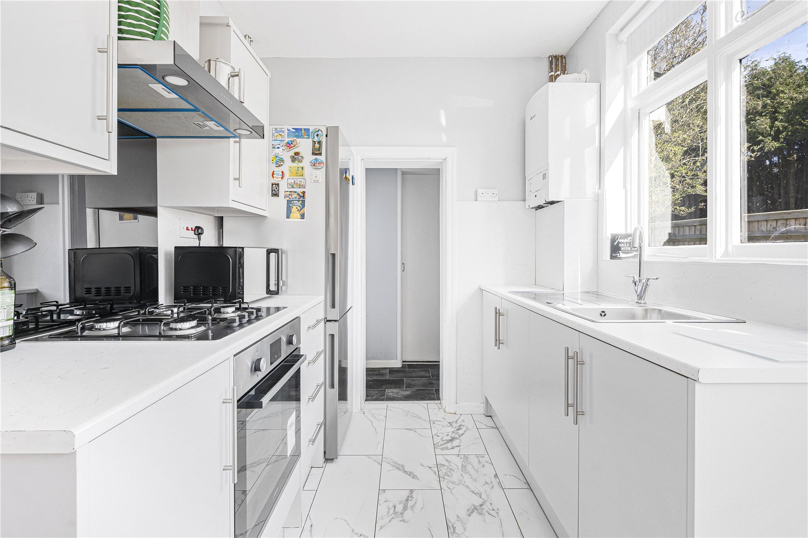 The kitchen sits to the back of the house, offering ample worktop space, built-in storage, pantry, and access to the garden via a side door. Beyond the kitchen is the added bonus of a downstairs WC.