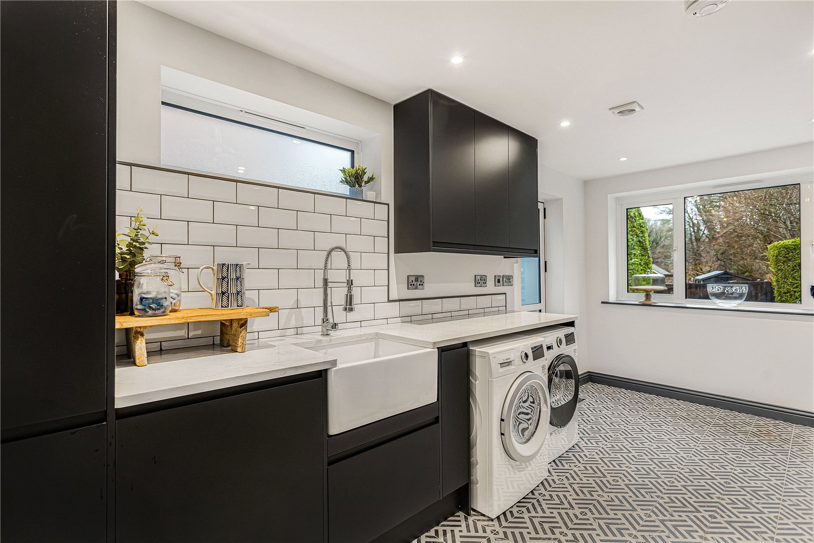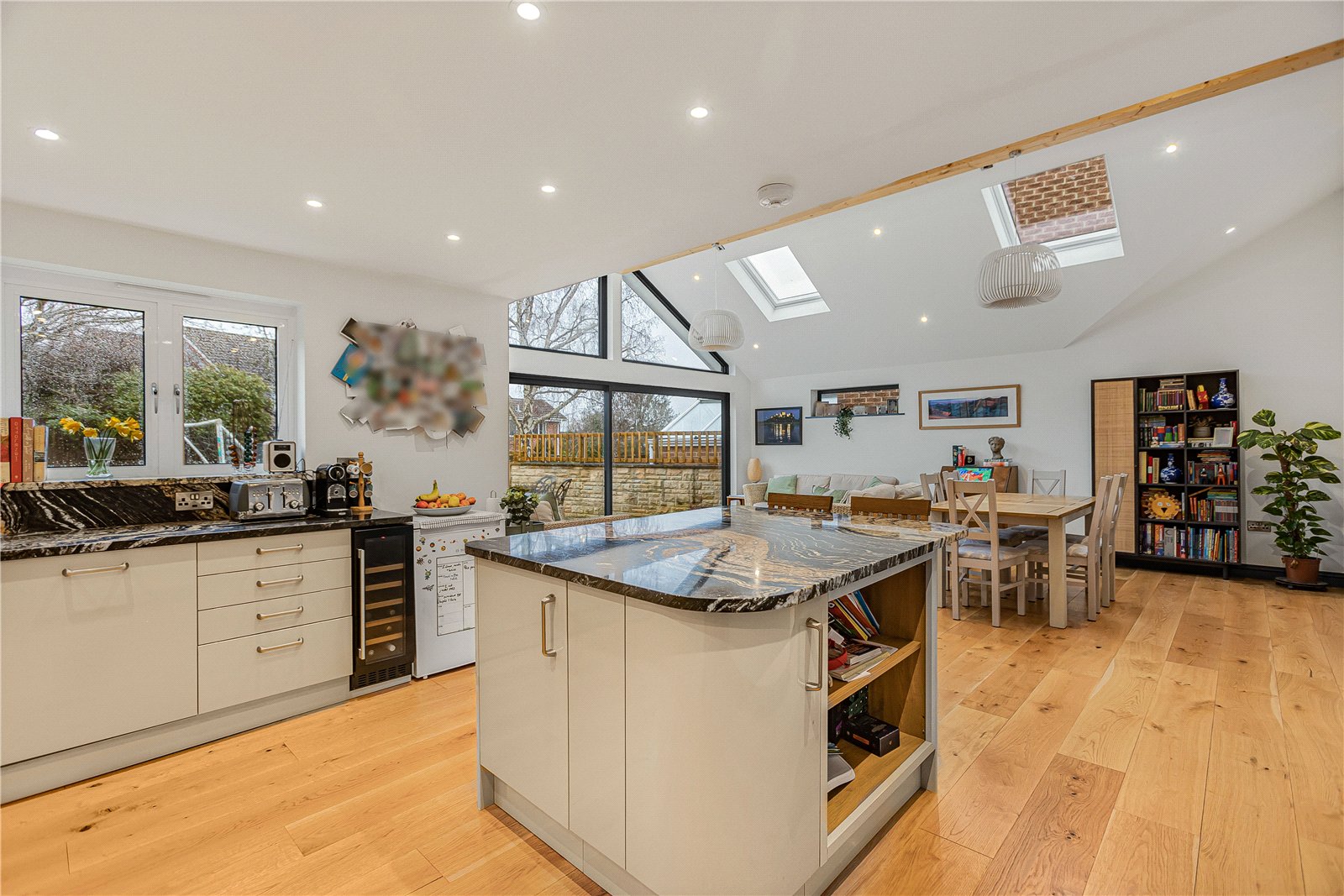 On the ground floor the accommodation consists of entrance porch leading to entrance hall with understairs storage and W.C. This leads to a spacious double aspect reception room with sliding doors that lead to the rear garden and patio area. On this floor there is also second reception, currently used as a study, and a third reception currently used as a playroom. This room also has sliding doors onto the kitchen/dining/living room. The open plan extended kitchen/dining/living room is a fantastic space, flooded with natural light and showcasing a beautiful, vaulted ceiling. A modern, fully fitted and contemporary kitchen hosts a range of built in Bosche appliances including microwave, oven and steam oven. There is a useful utility room on this floor with personnel door to the front garden.
