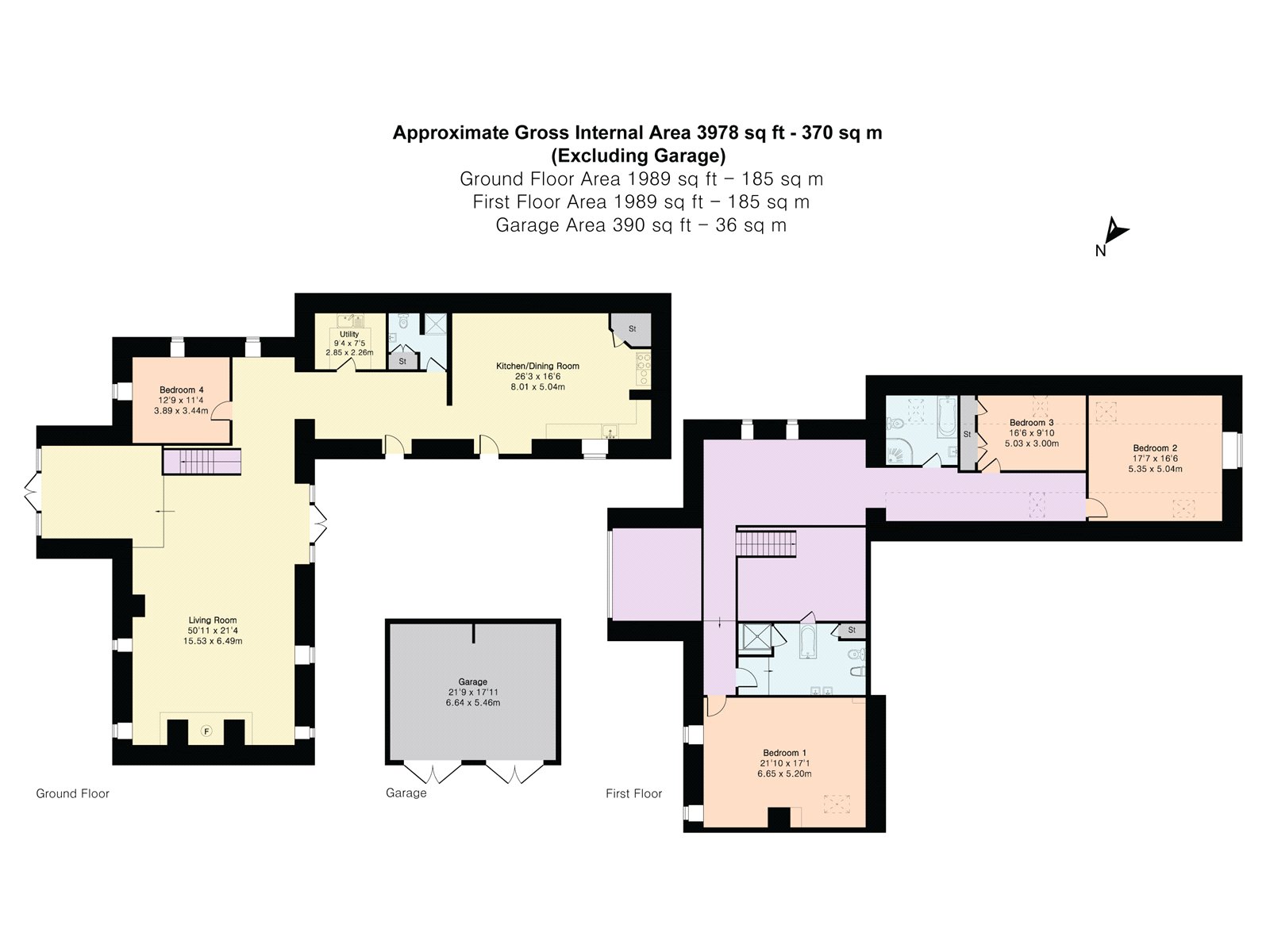 The ground floor features a spacious open-plan reception area with exposed beams, incorporating an entrance hall, a sitting room with a log burner. This level also includes a charming country-style kitchen with a larder and generous dining space, a utility room, a shower room, and one double bedroom.