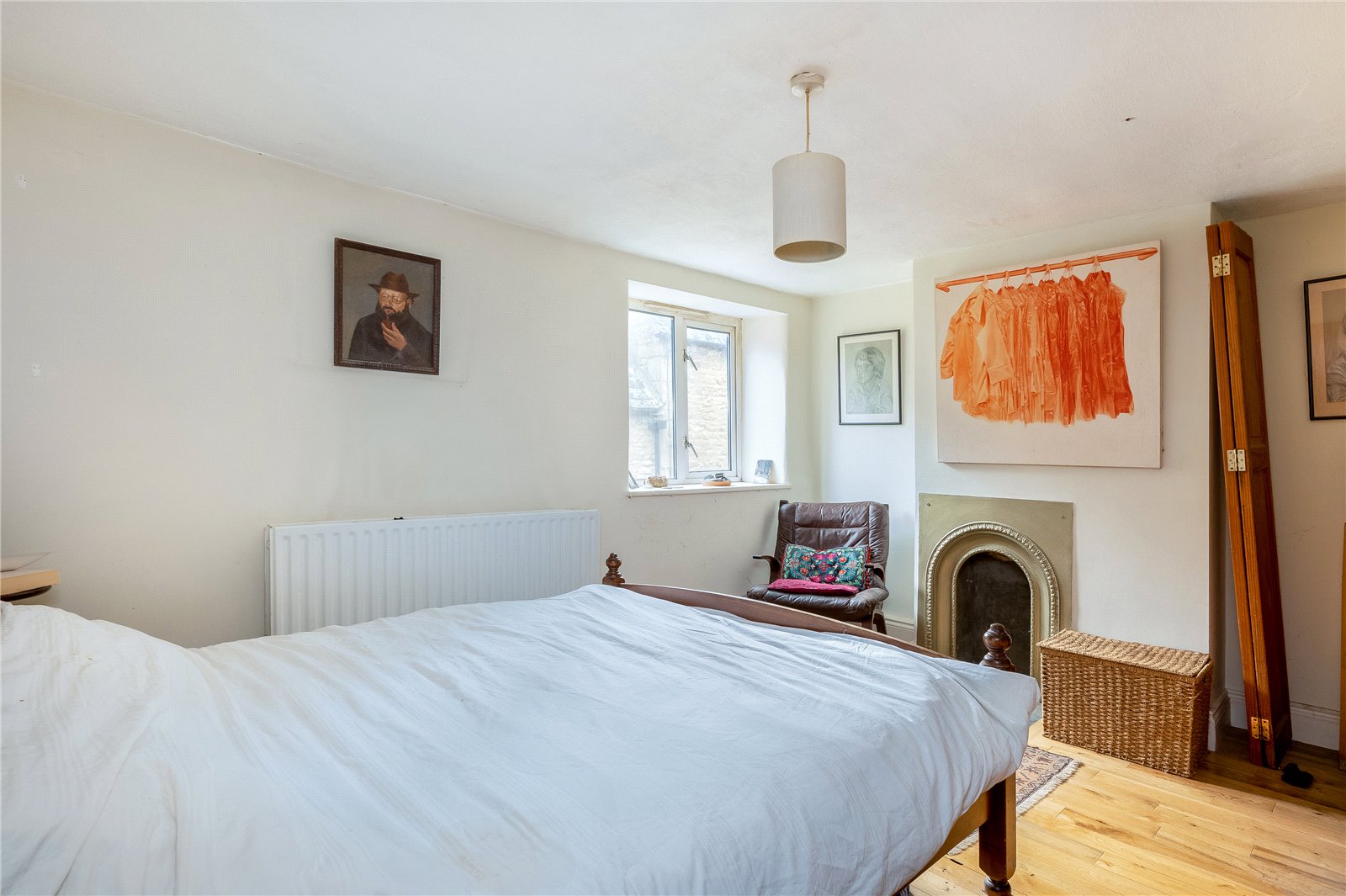 Bedroom One with Double Glazed Window to Front Aspect, Exposed Wooden Floor, Wardrobe Recess and Attractive Ornate Fireplace.