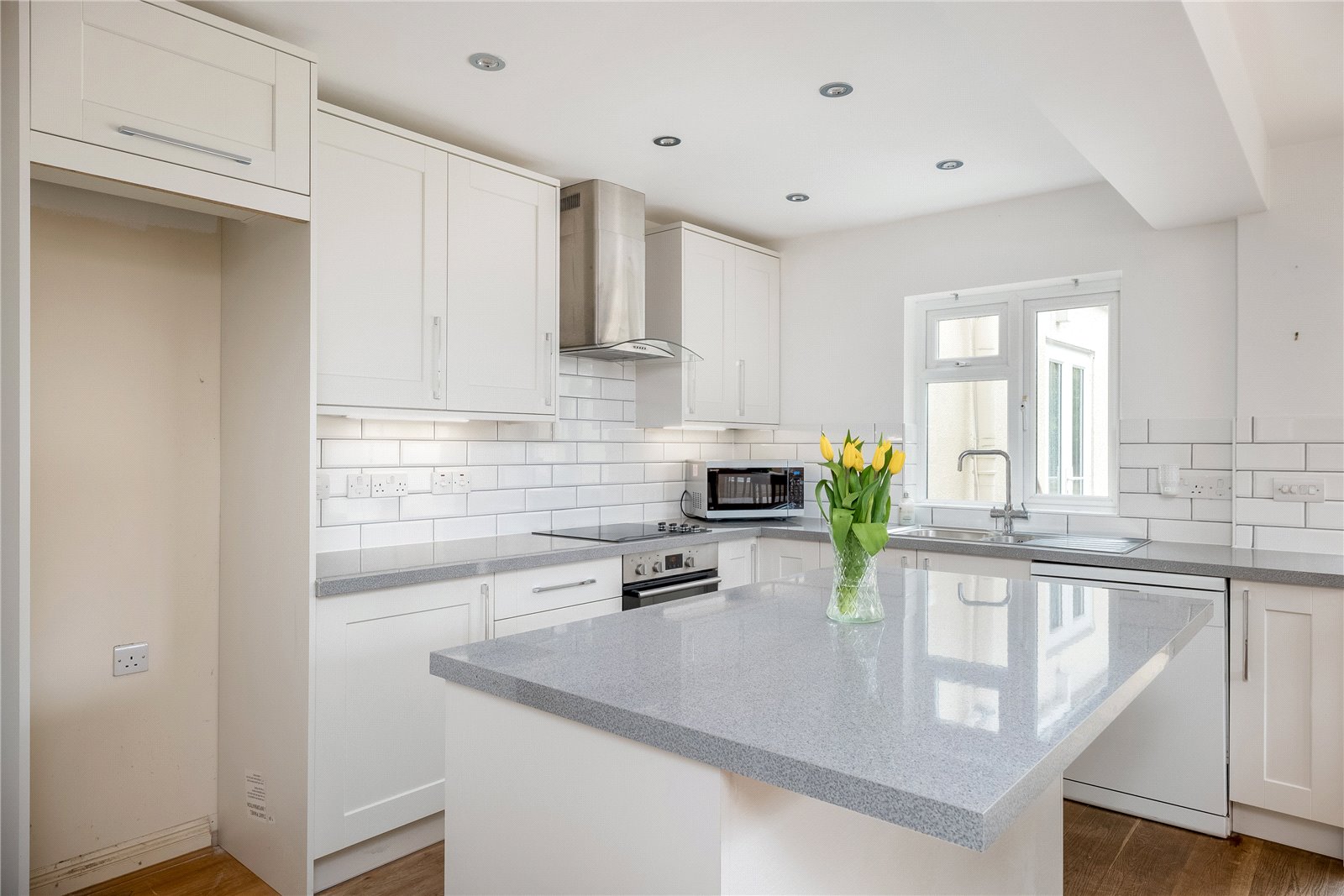 Fitted With a Range of Matching Wall and Base Units with Work Surface. Part Tiled Walls, Electric Hob With Oven Below and Extractor Hood Above. Plumbing For Dishwasher. Central Island with Drawers. Double Glazed Windows to Rear and Side Aspect. Double Glazed French Doors to Rear. Understairs Larder Cupboard. Wooden Floor and Space for Fridge Freezer.