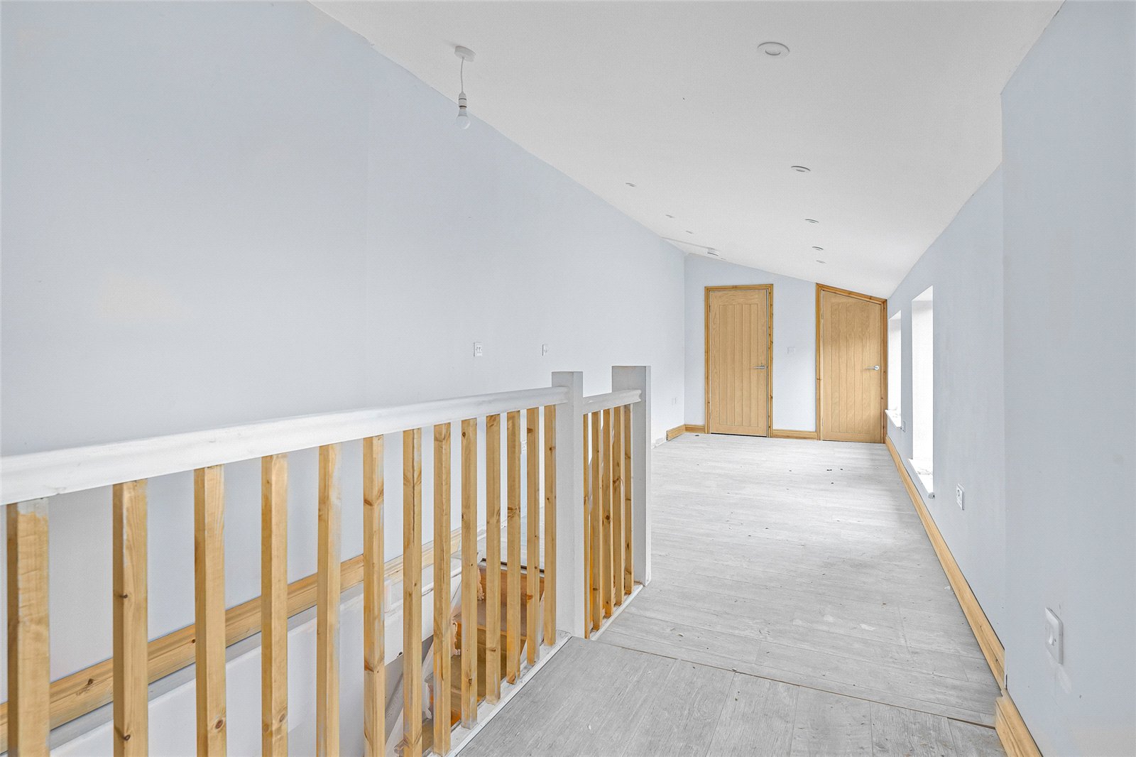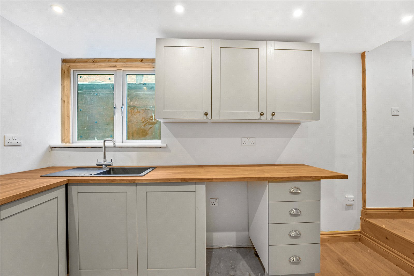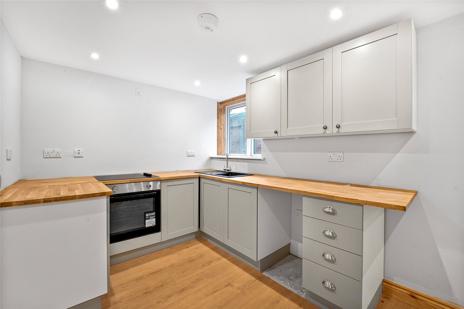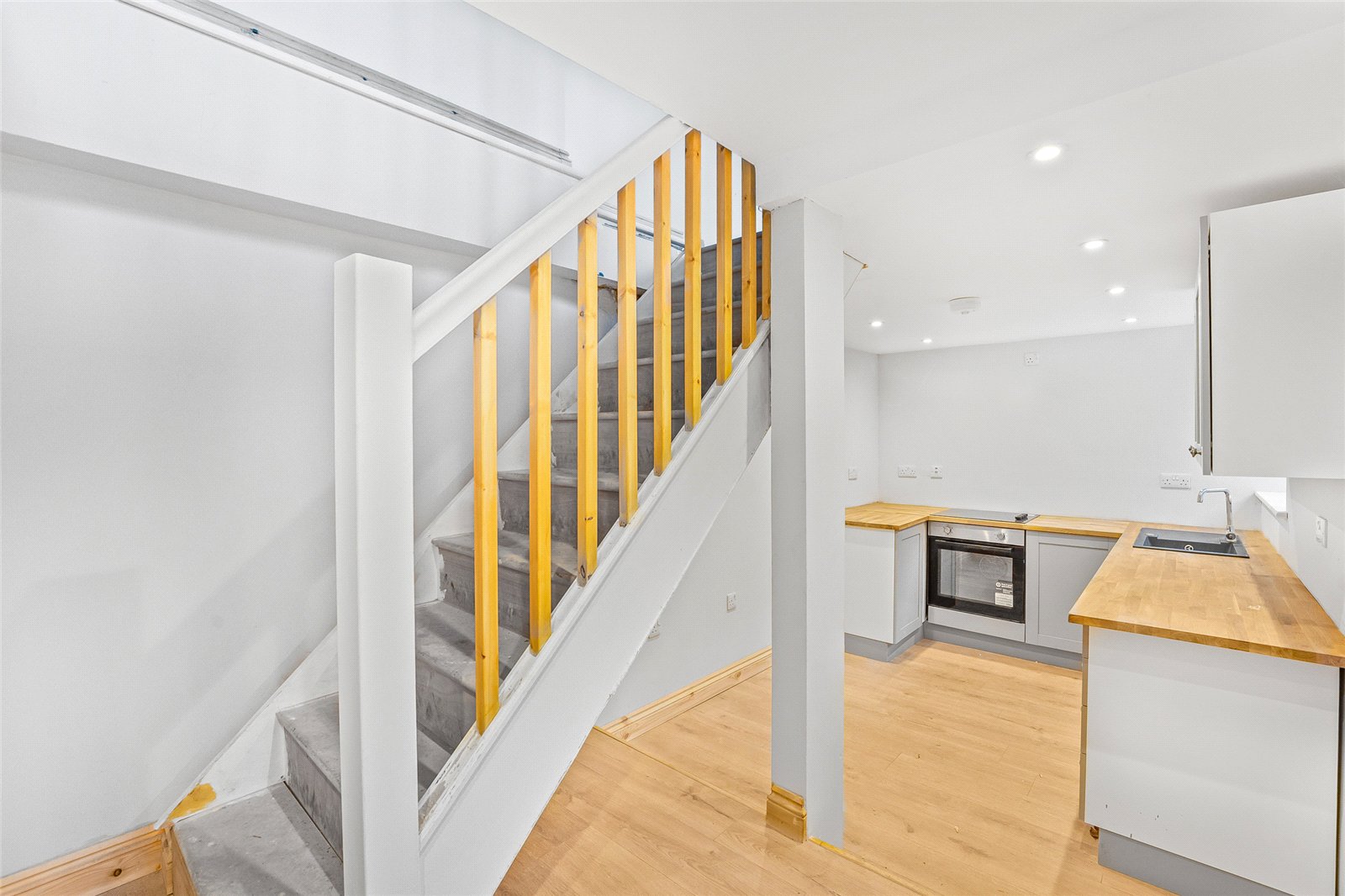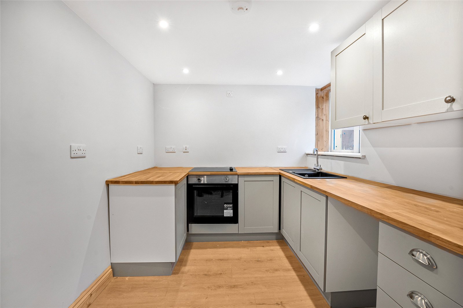 Kitchen/Breakfast Room: Fitted with a single base sink unit with cupboard underneath. Range of matching wall and base units with wooden worksurfaces, integrated electric hob with oven below. Plumbing for washing machine and dishwasher. Space for fridge/freezer, wooden floor, balustrade staircase to first floor level.