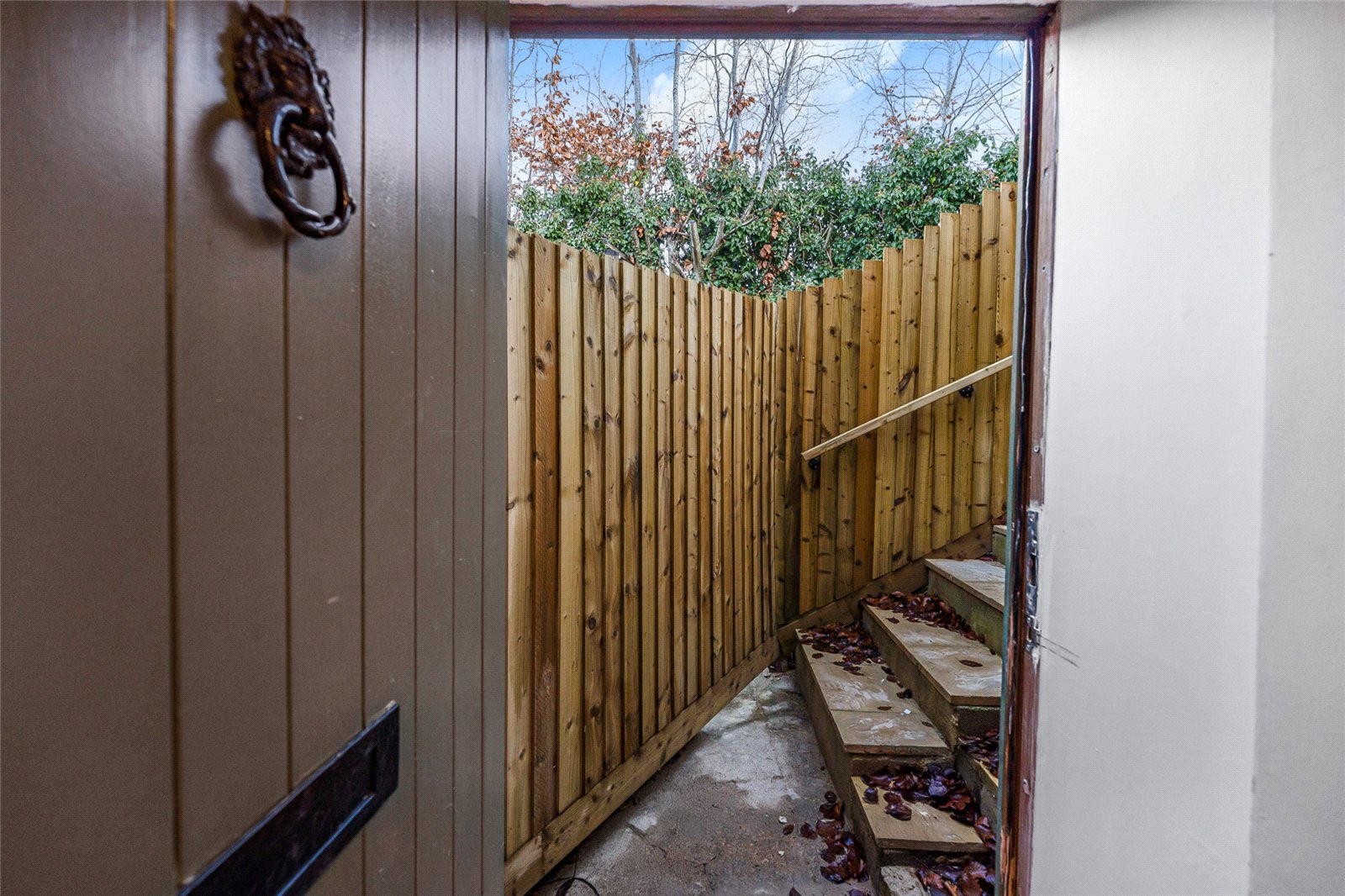 From the car parking space, a pathway leads to the front door that opens into a