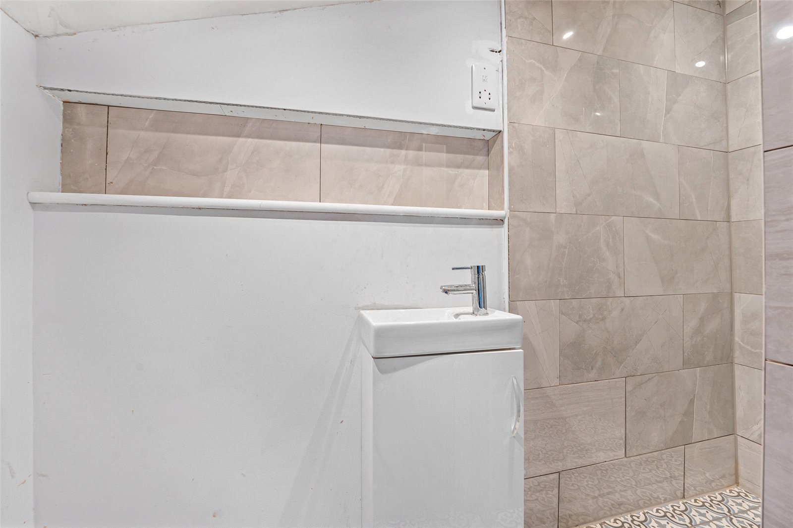 Shower Room: Comprising of white suite of double shower cubicle with shower over, hand wash base with vanity unit below, low level WC, tiled floor, part tiled walls.