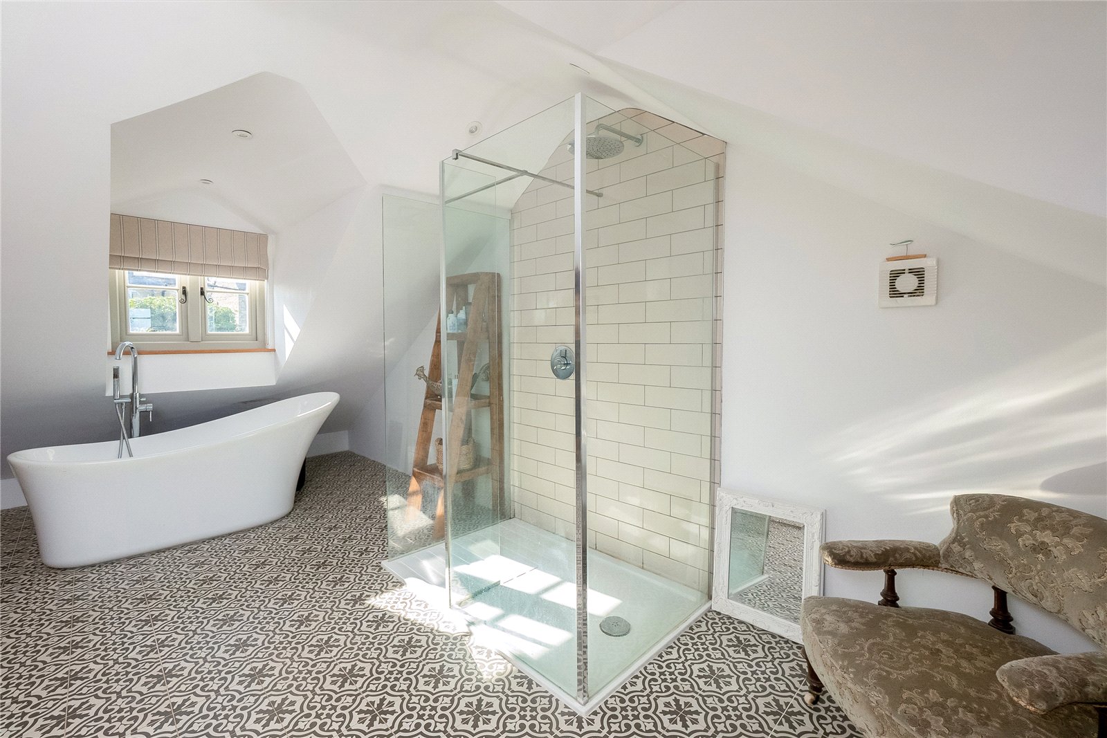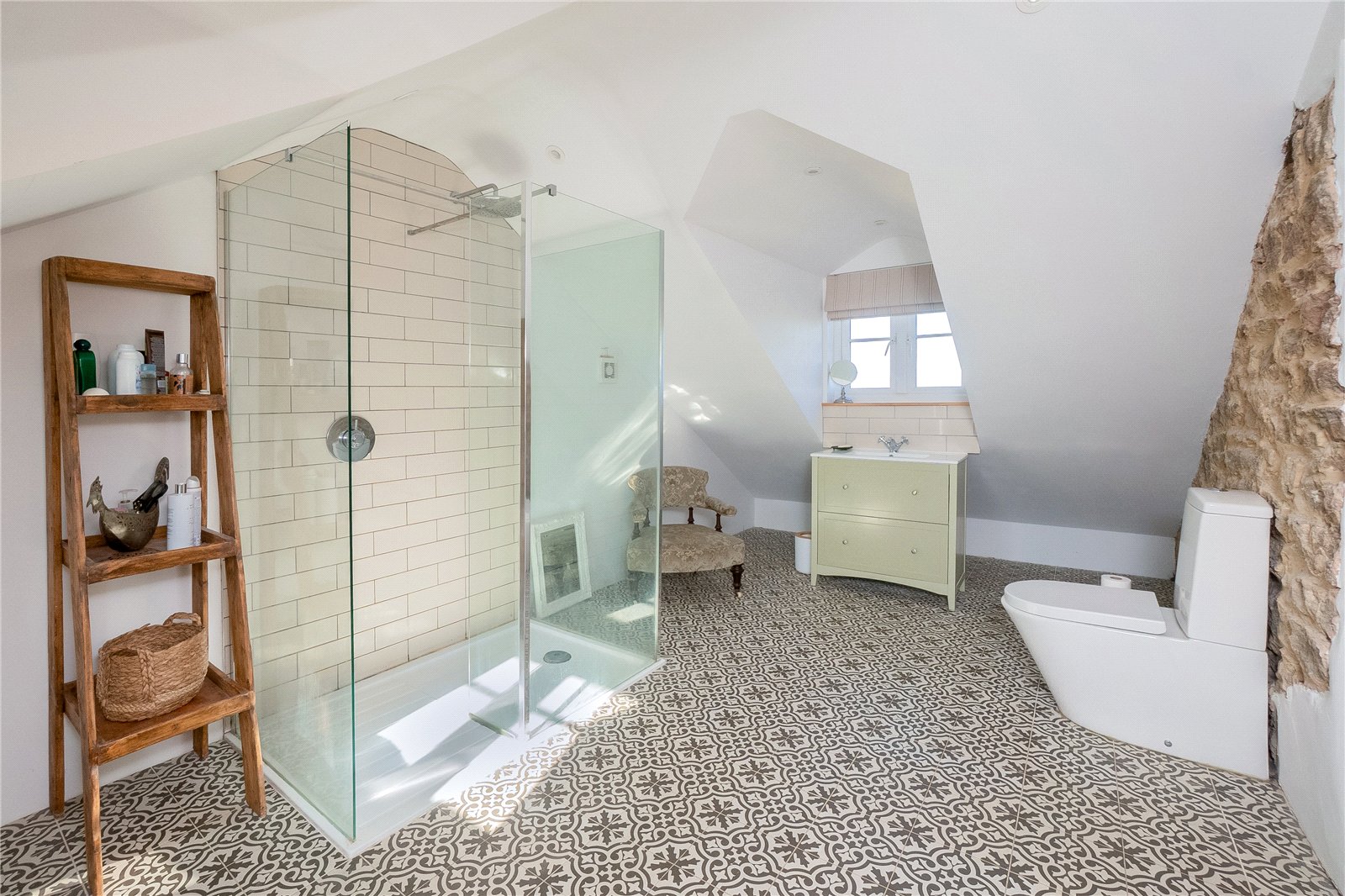 En-Suite Bathroom - Comprising of White Suite of Freestanding Bath, Walk-In Shower Cubicle, Hand Wash Basin with Vanity Unit Below, Low Level WC, Part Tiled Walls, Tiled Floor, Double Glazed Window to Front Aspect, Double Glazed Window to Front Aspect, Double Glazed Window to Rear Aspect with Views Towards Countryside, Exposed Stone Wall.