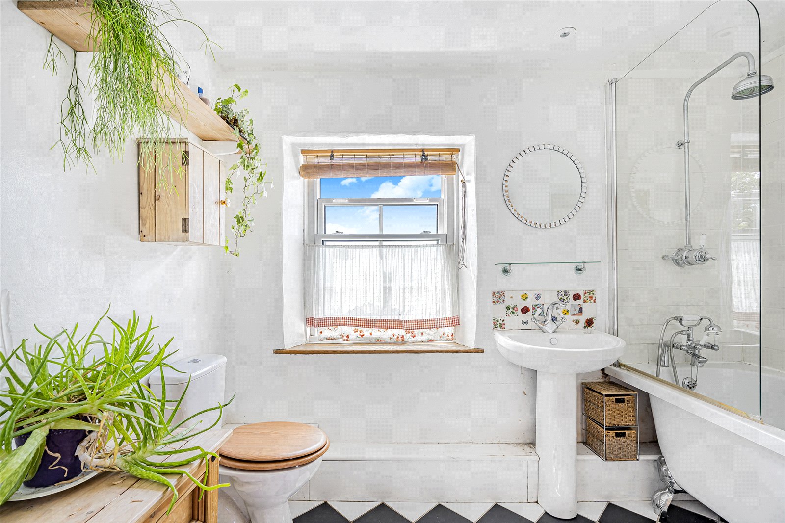 Bathroom: Tiled floor, sash windows to front aspect, low level WC, hand wash basin, panelled bath, part tiled walls.