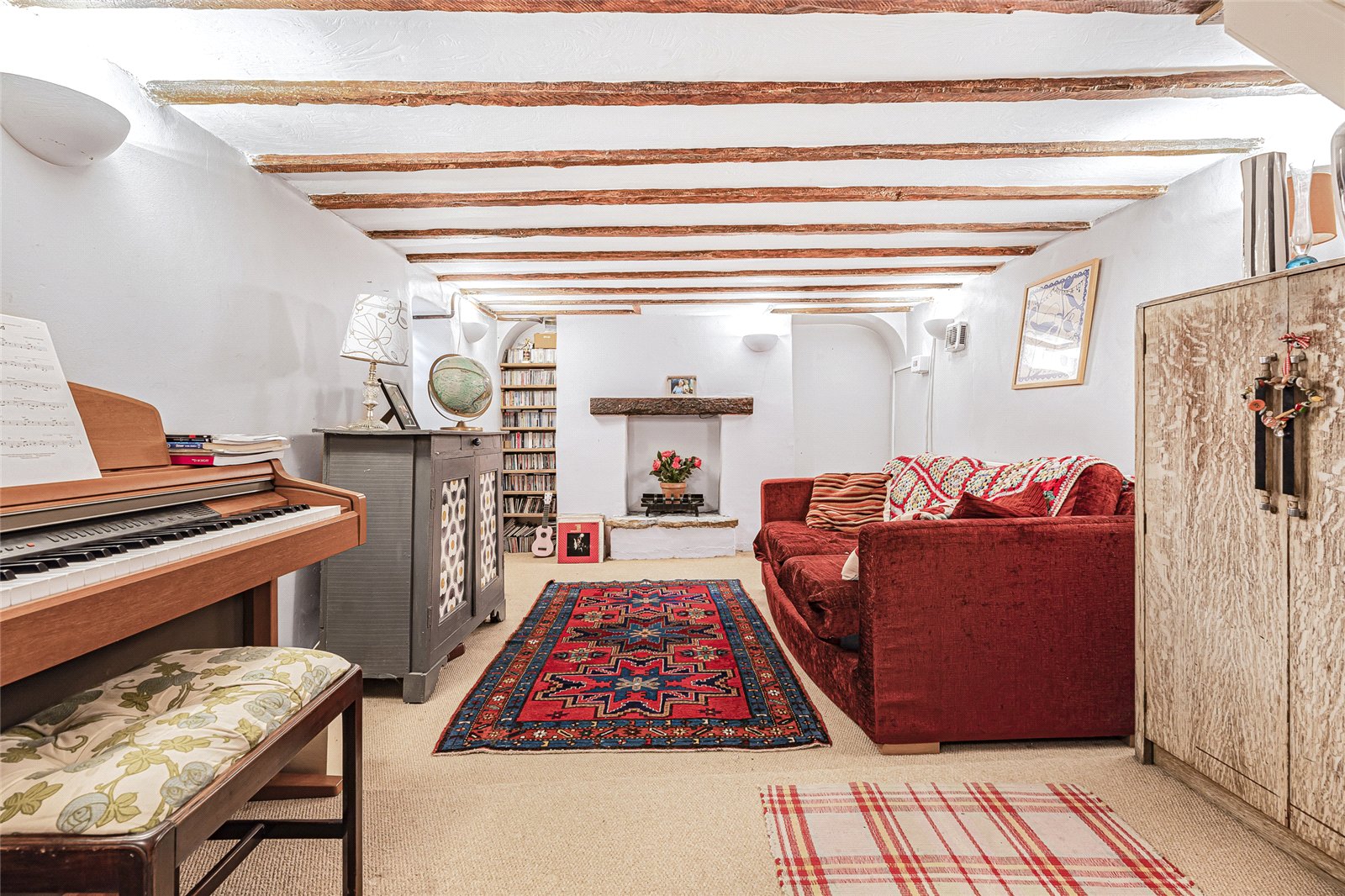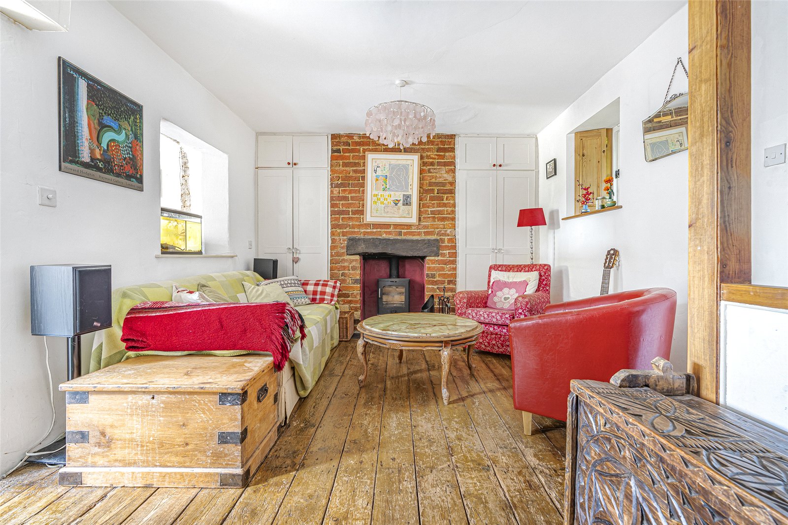 Living Room: Wooden floorboards, windows to rear aspect, feature red brick chimney breast with wood burner. Built-in cupboards into chimney recess, open windows to kitchen. Stairs leading to first floor level and stairs lead to basement.