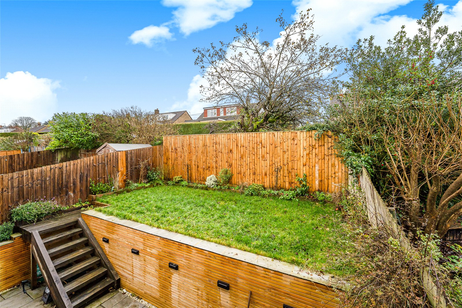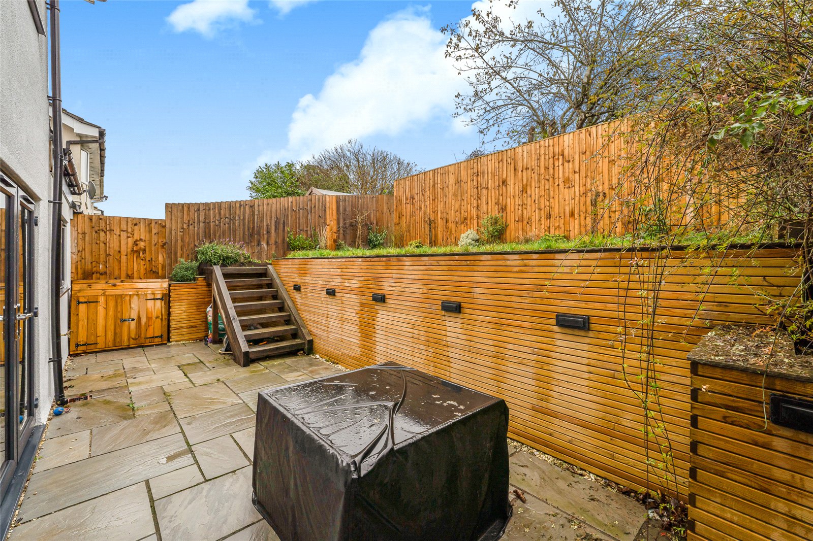 The rear garden is fully enclosed by wood panel fencing. A newly laid terrace area provides a smart seating space with steps leading up to the lawn.