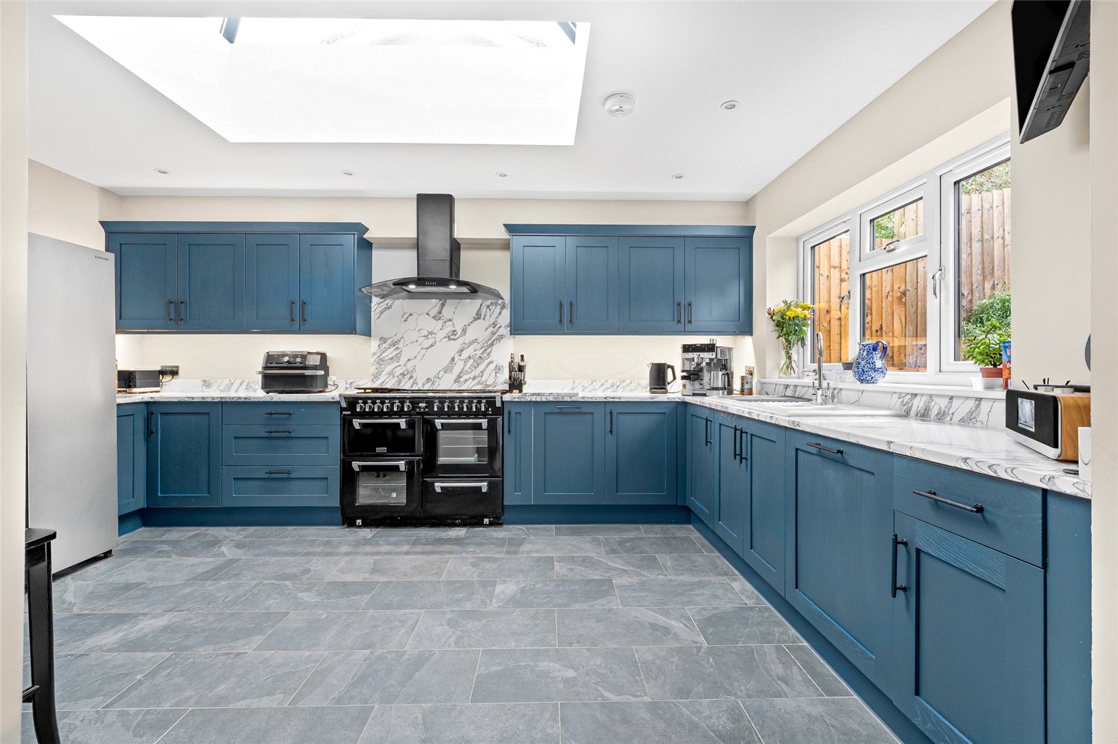 Kitchen: Double-glazed window to the rear aspect; skylight; quartz work surfaces; a range of wall and base units; Stoves Rangemaster; integral dishwasher; sink; underfloor heating.