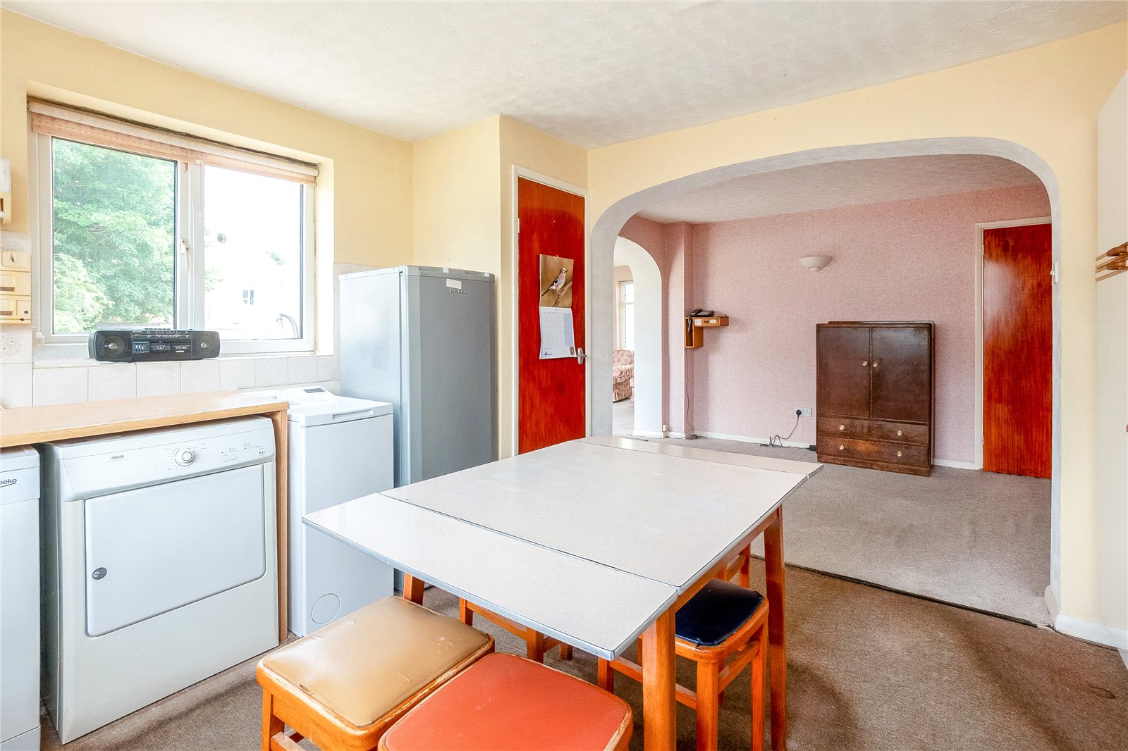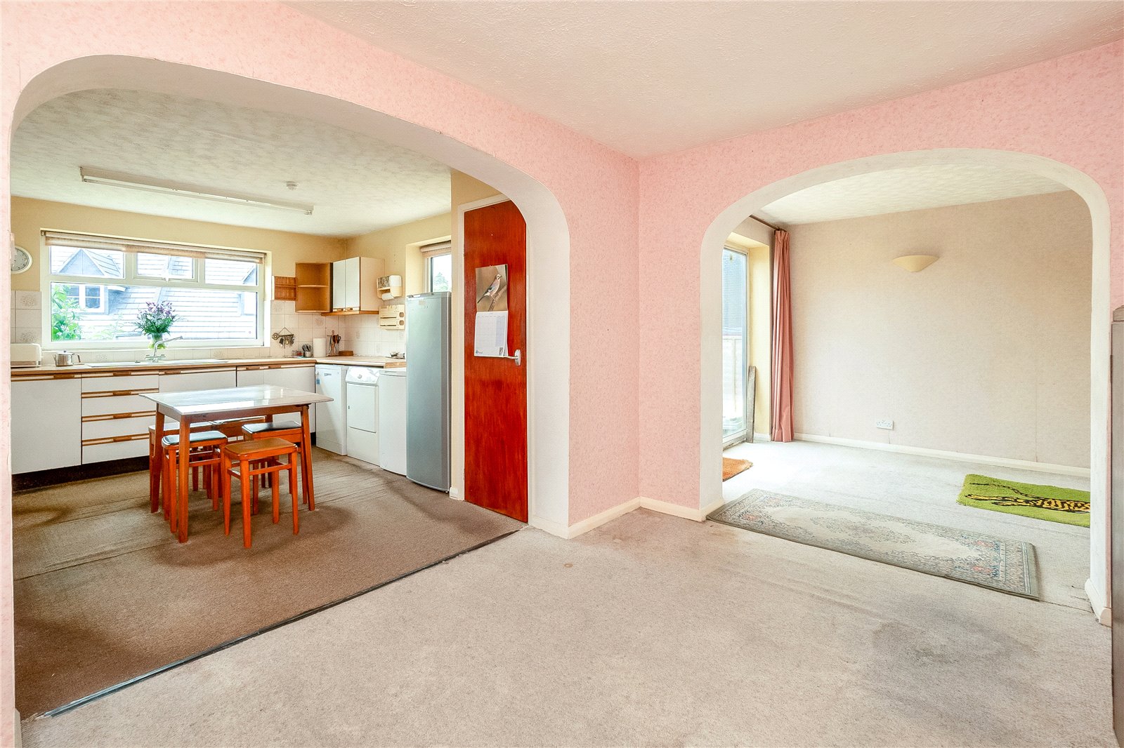 Open Plan Kitchen/Dining Room open plan with archway opening into second reception room, with double glazed window to front aspect and double glazed patio door leading to rear garden.