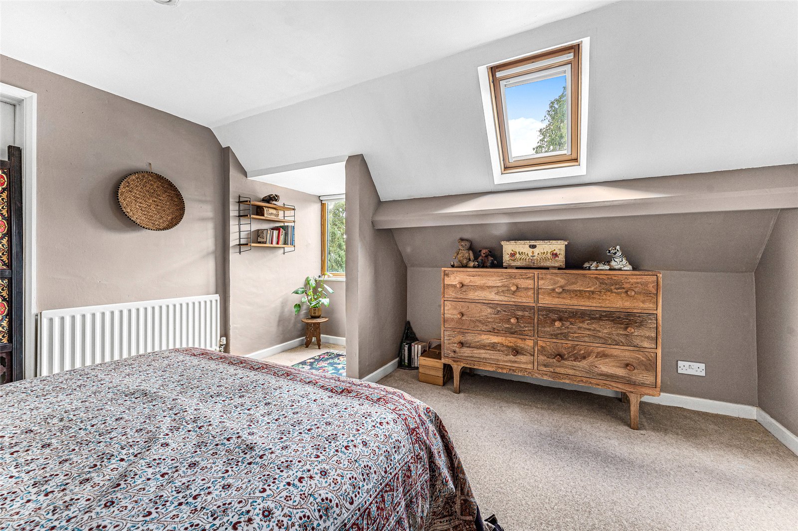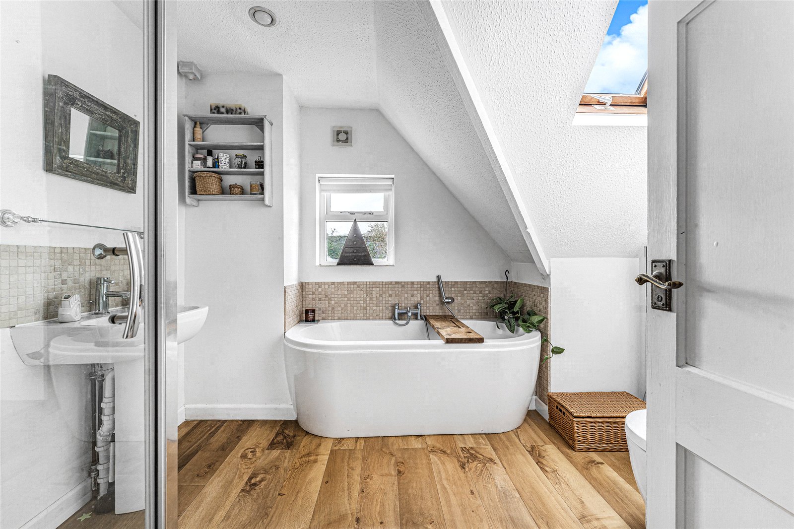 Bathroom: Velux window, window to side aspect, panelled bath, low level WC, hand wash basin, walk-in shower cubicle, wall mounted triton shower.