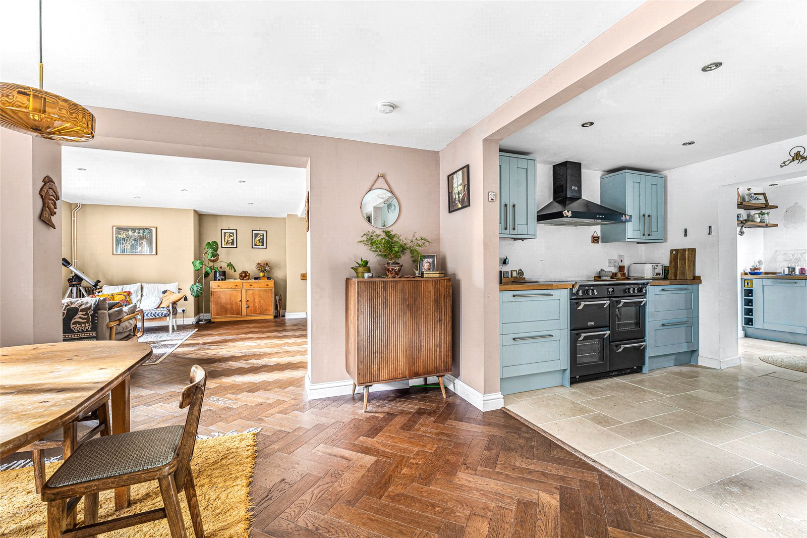 Open-Plan Kitchen, Dining and Lounge Area: Feature open fireplace, double glazed window to front aspect, engineered oak parquet flooring, stairs leading to first floor, double glazing patio door to rear.
