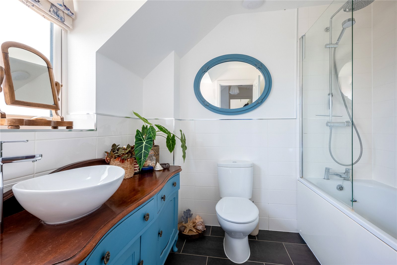 Bathroom Comprising of White Suite of Bath with Upgraded shower over Oval Hand Wash Basin set ontop of a Dresser Unit with Cupboard and Drawers Below and a Low Level WC, Part Tiled Walls and Double Glazed Window to Rear Aspect.