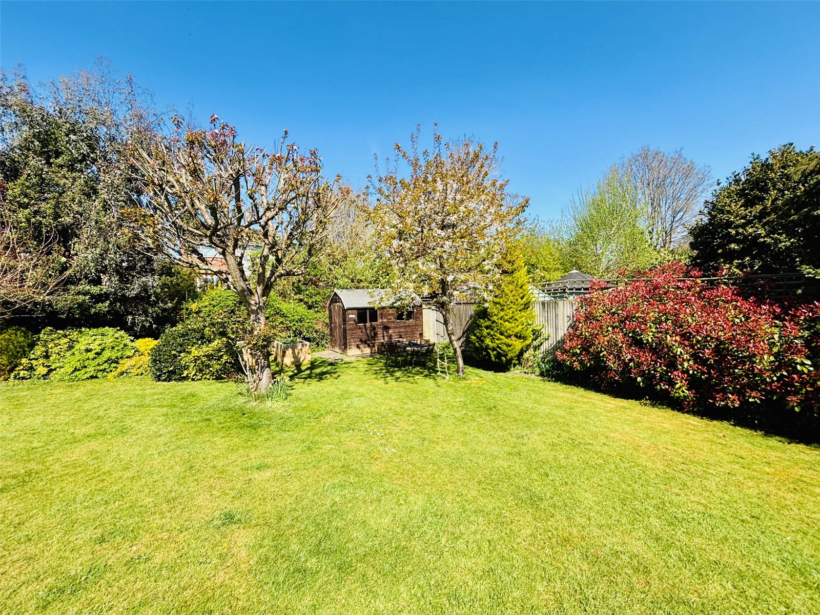 The beautifully landscaped rear garden boasts a generous lawn surrounded by well-established, meticulously stocked borders. A fabulous terrace, complete with an electric awning and integrated lighting, offers the perfect space for outdoor relaxation, while a well-sized shed provides convenient storage.