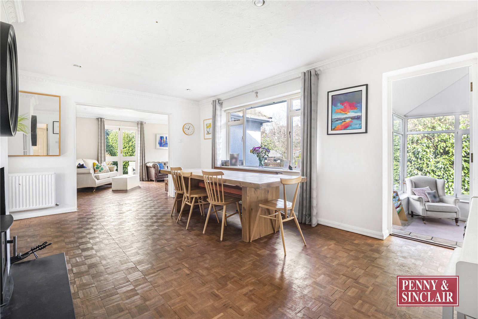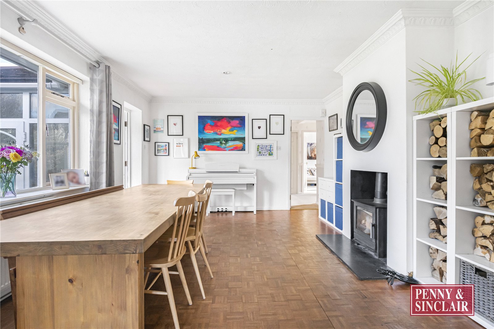 The entrance hall opens into a beautifully proportioned sitting room, featuring a dual aspect and French doors that lead out to the terrace. leading off is an impressive dining room, complete with a gas fire and feature surround, while steps lead down to a charming garden room with double doors opening onto the stunning rear garden.