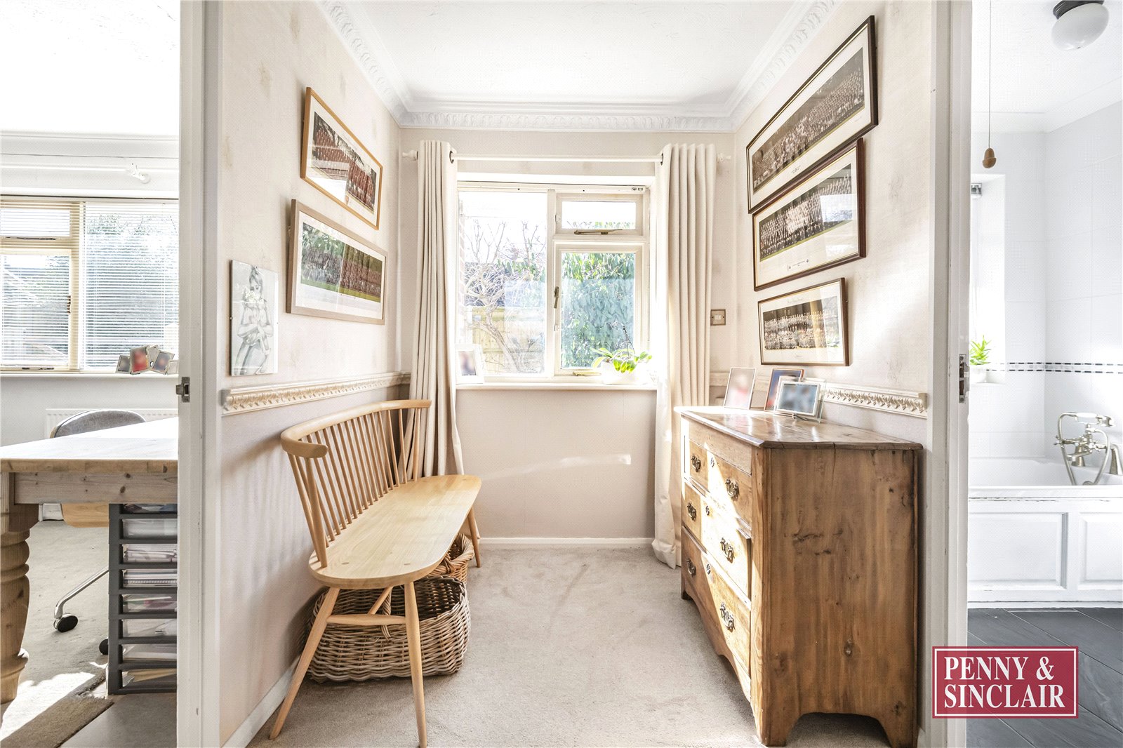 The kitchen/breakfast room enjoys a bright, front-facing aspect and has been refitted by the current owners to include underfloor heating and a wine fridge. A separate study, also positioned at the front, provides a dedicated workspace. Off the hallway, there is a shower room with a white suite, as well as a further well-presented bathroom with white sanitary ware and under floor heating.