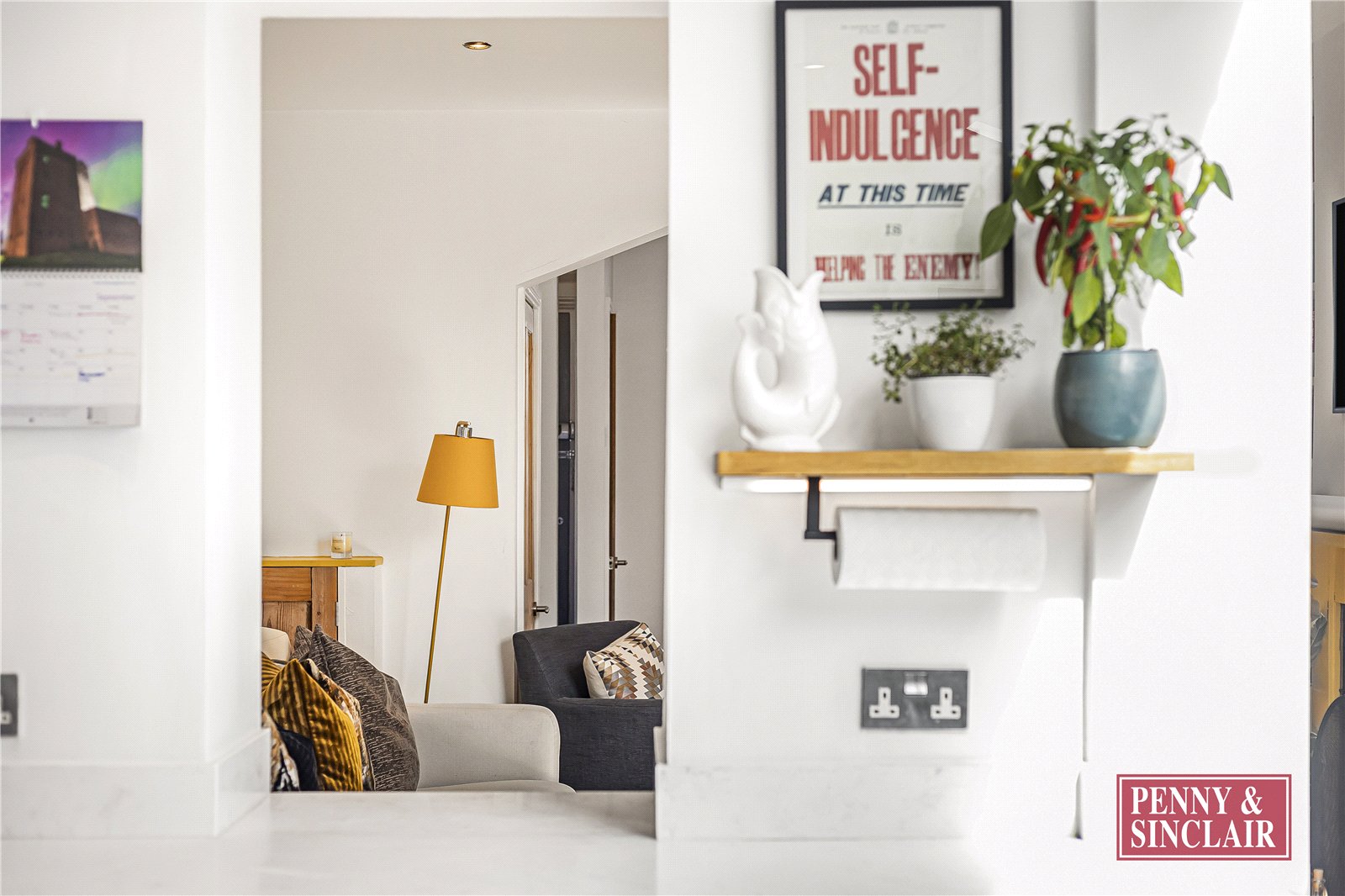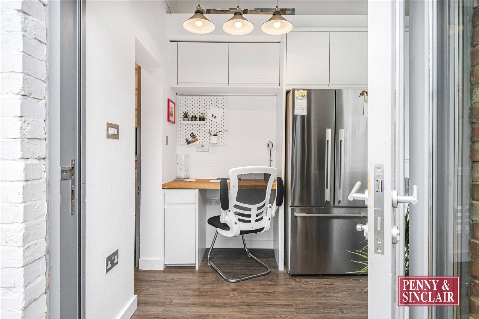 Adjoining the kitchen is a cosy yet elegant living room, complete with a feature fireplace and bespoke shelving, offering the perfect balance of warmth and sophistication. Hardwood flooring runs throughout, enhancing the sense of space and quality.