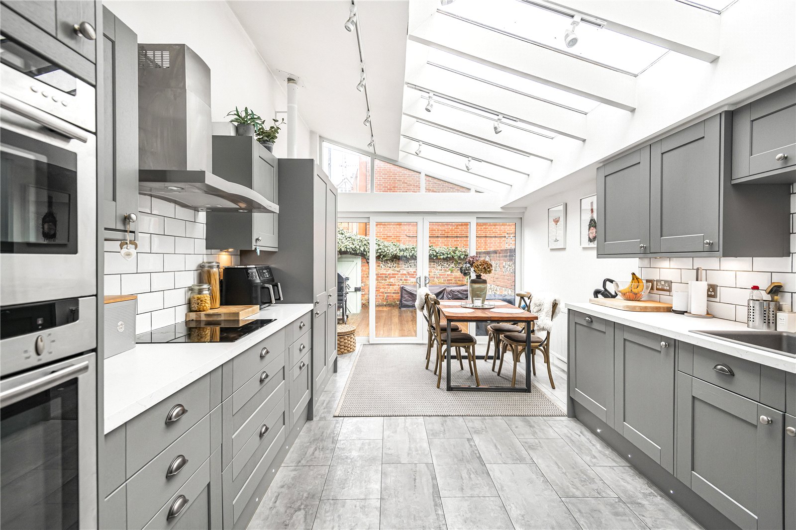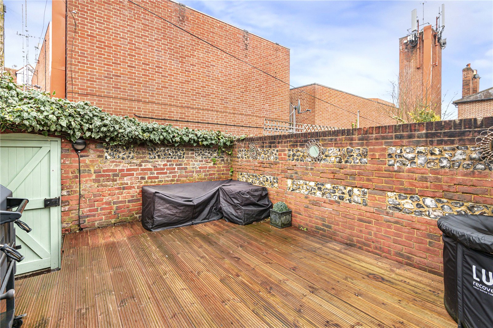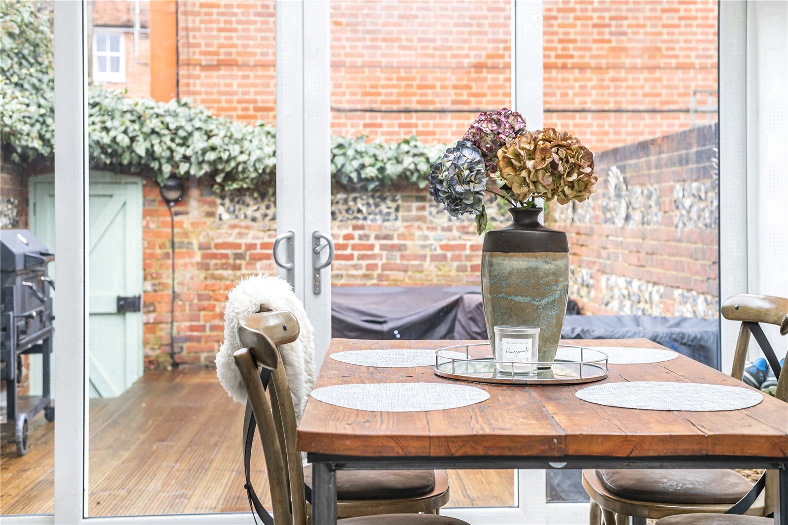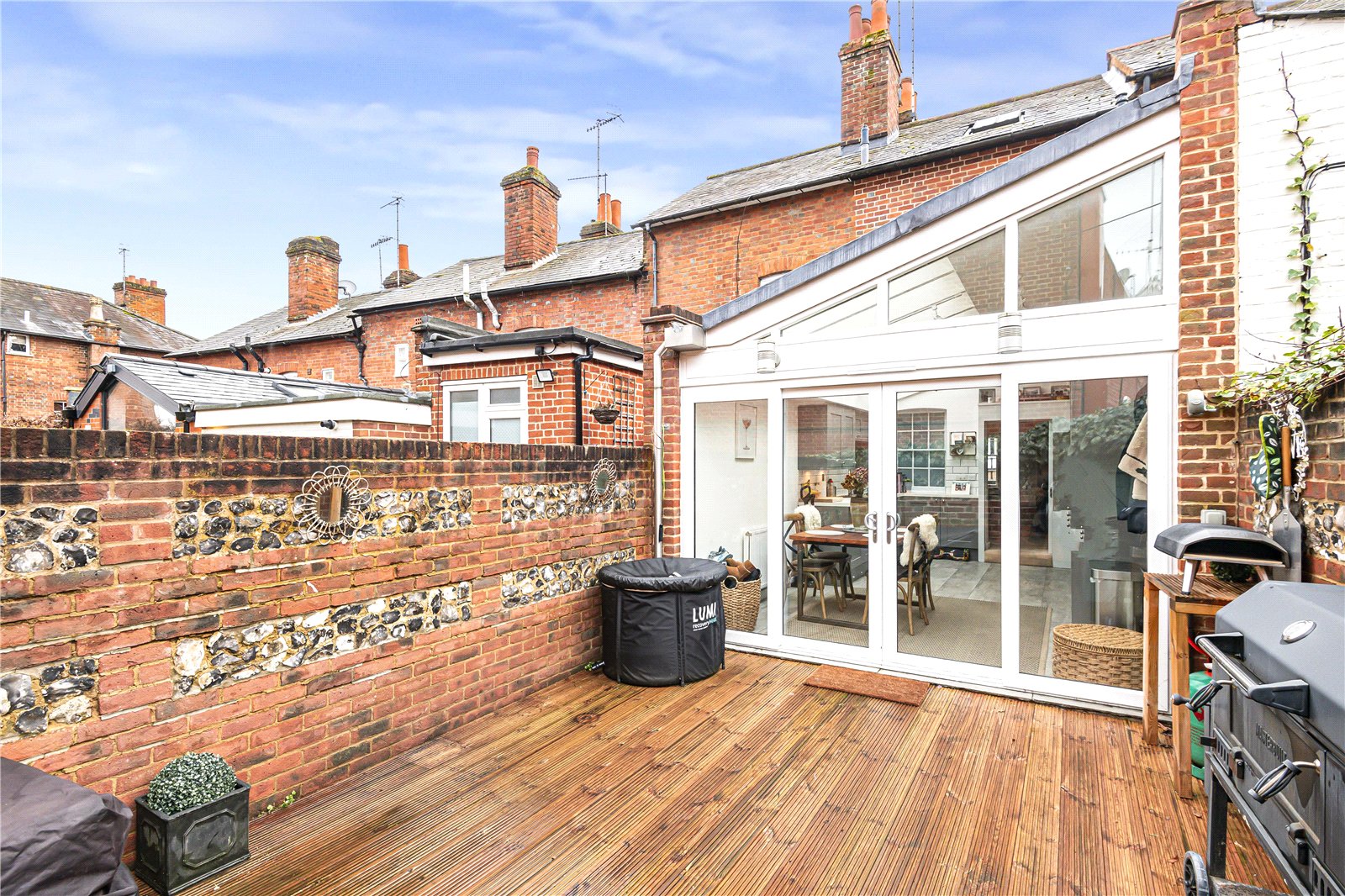 At the rear of the property lies the heart of this delightful home: an open-plan kitchen and dining area. This space is enhanced by a vaulted ceiling and bi-fold doors that open directly onto a private, pretty decked courtyard, enclosed by characterful brick and flint walls and offering handy rear access.