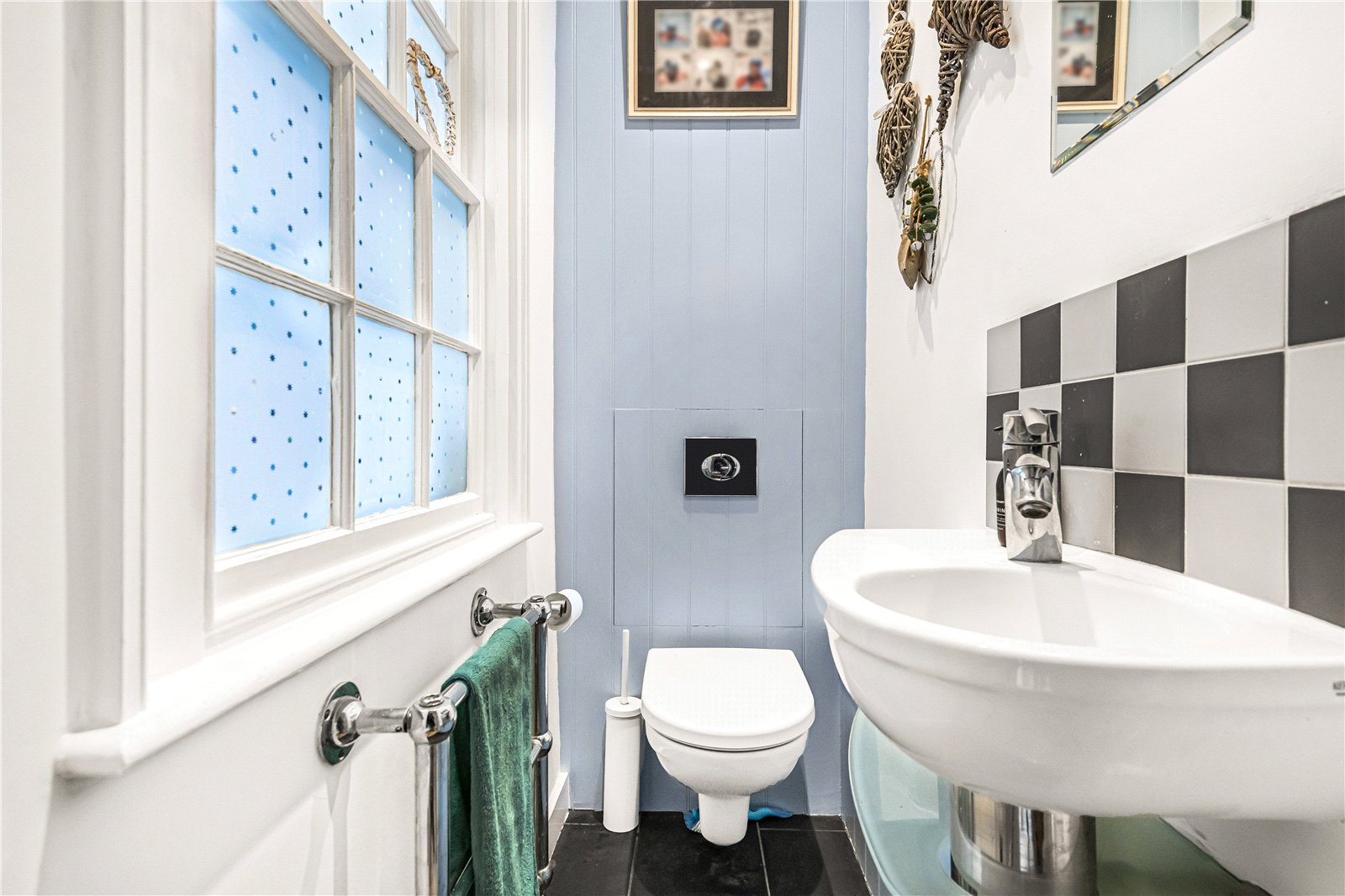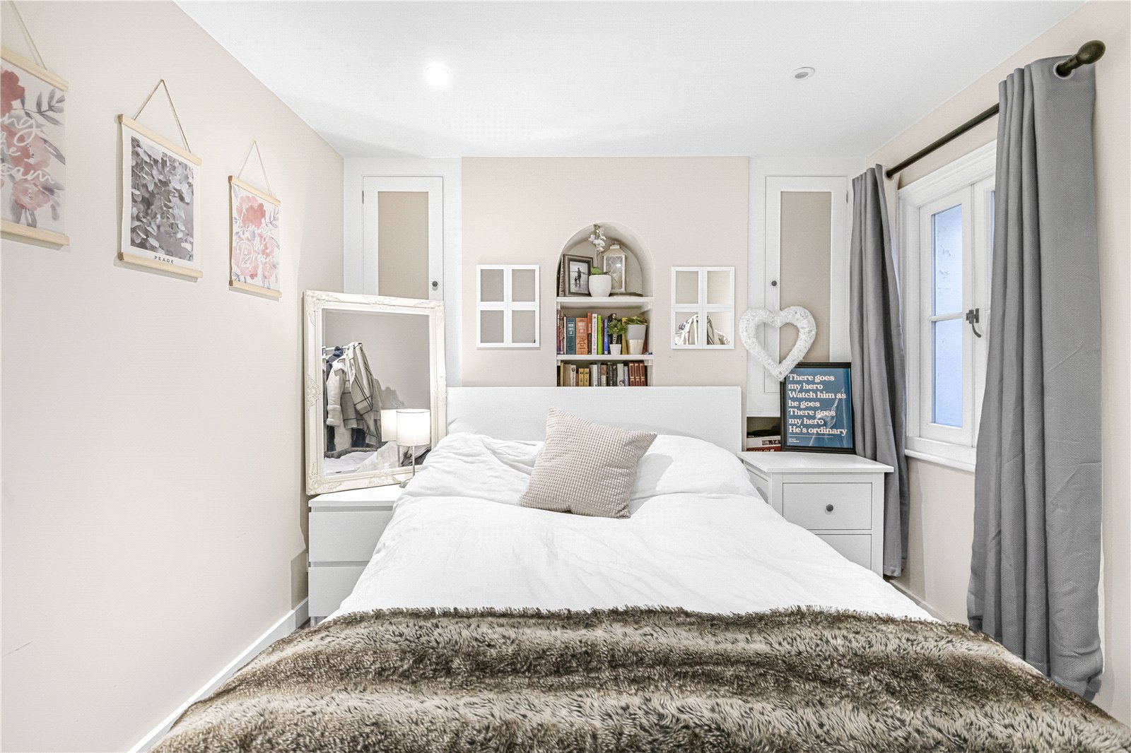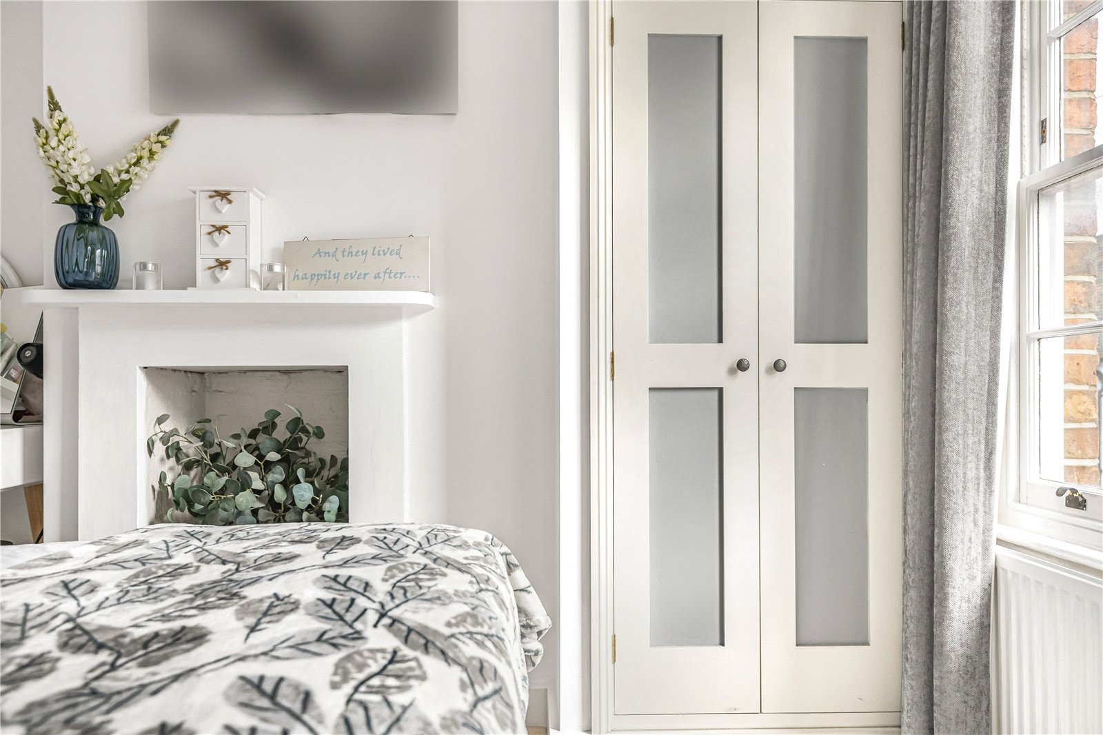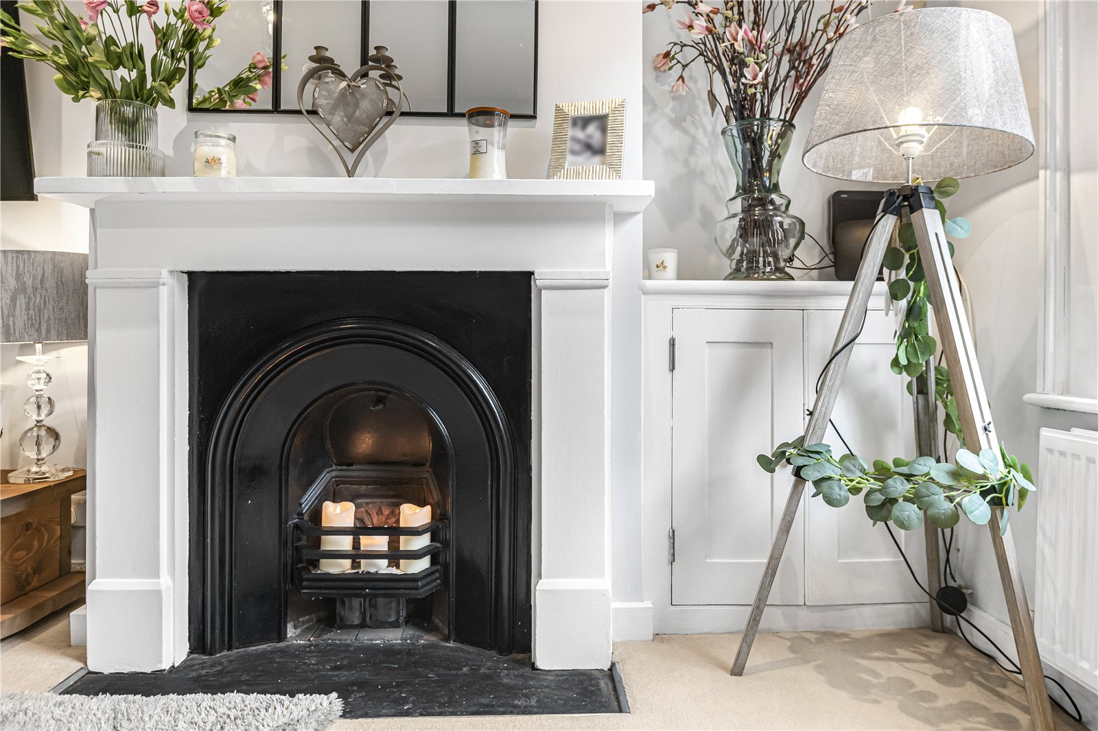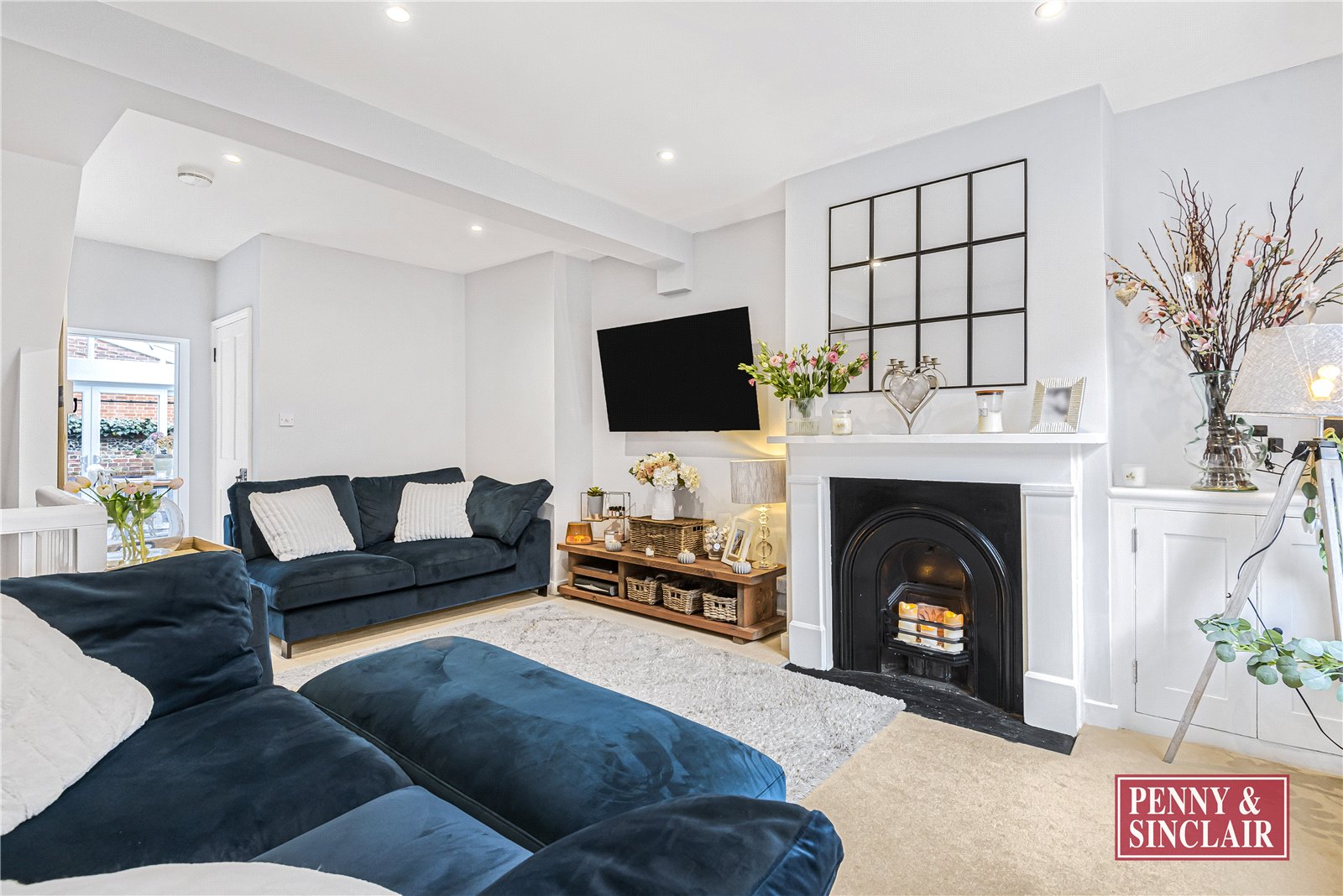 The property features an elegant, open-plan sitting room featuring a charming fireplace and convenient access to the ground-floor cloakroom. From here, stairs lead down to a stunning third bedroom in the basement - a tranquil space that remains cool in summer and cosy in winter, benefitting from an abundance of natural light and ample fitted storage.