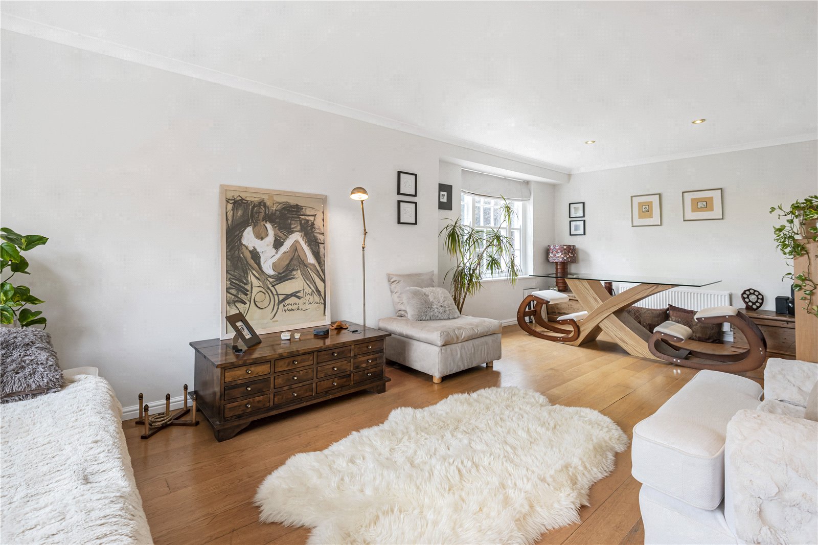 Beyond lies the heart of this exceptional penthouse: a stunning open-plan dual aspect living and dining room, the large windows flooding the space with natural light and offering far-reaching views over the gardens and across Henley. It's a tranquil and inspiring setting that perfectly reflects the overall character of the home.