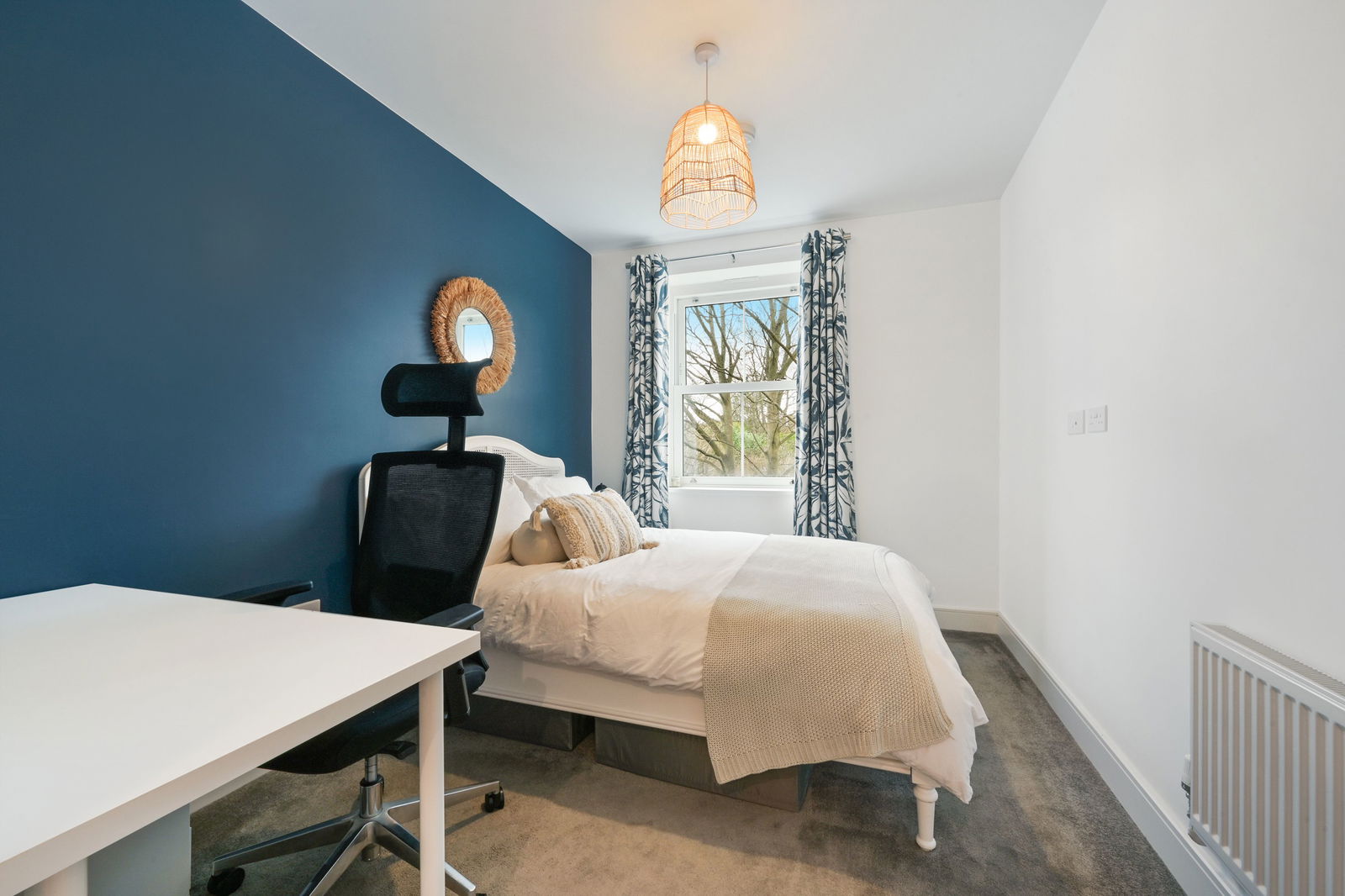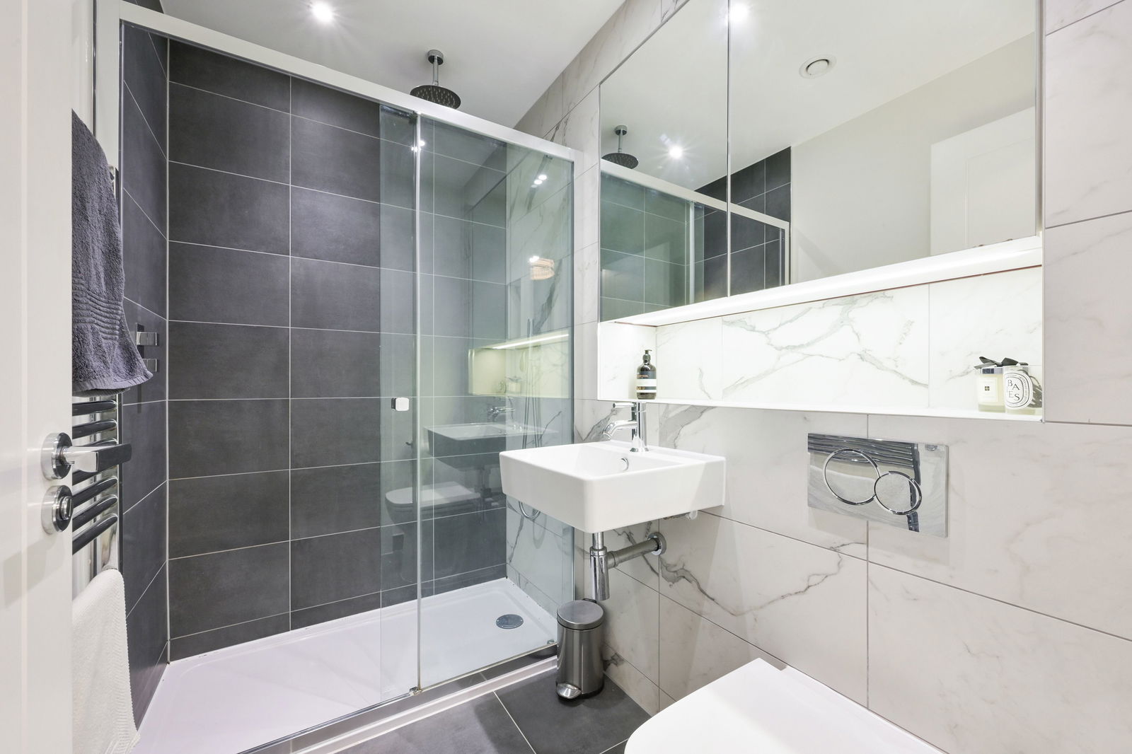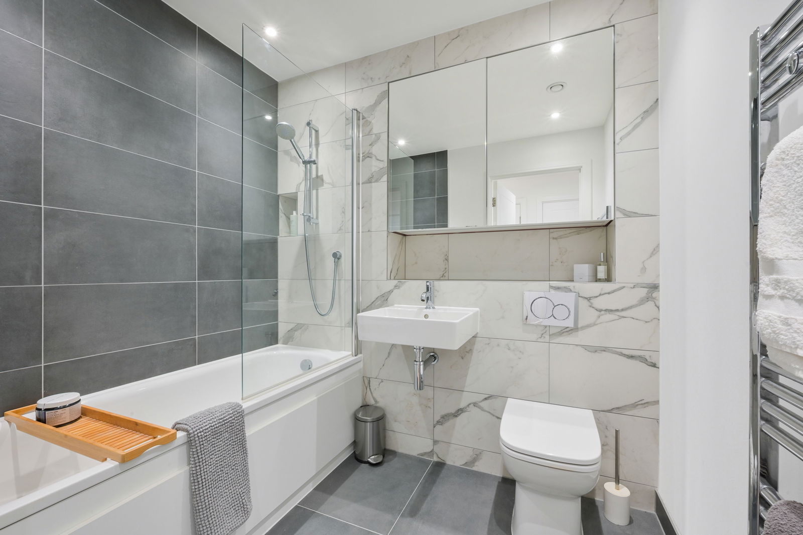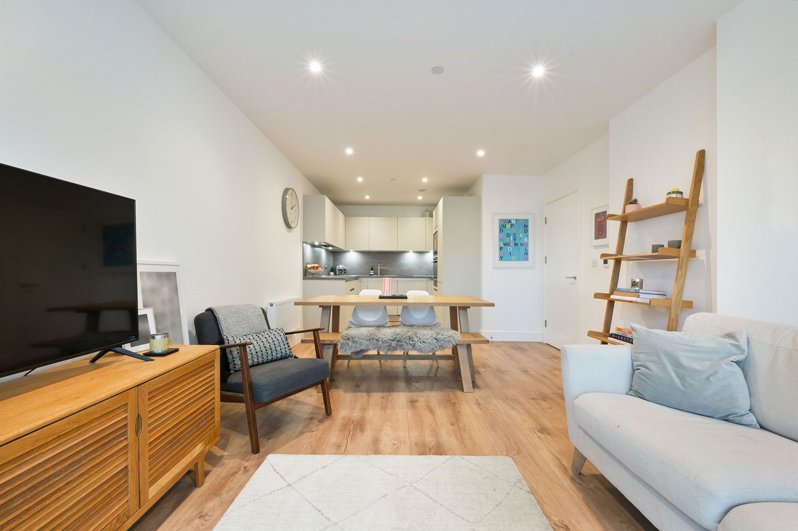 The modern kitchen is fully integrated and thoughtfully designed, featuring an induction hob with extractor, oven, microwave and dishwasher, along with an excellent range of wall and base units providing ample storage. The principal bedroom is a particularly attractive feature, offering fitted wardrobes and a sleek en-suite shower room with walk-in shower, vanity unit and WC. The second double bedroom is generous in size and is served by a stylish family bathroom fitted with a bath and overhead shower.