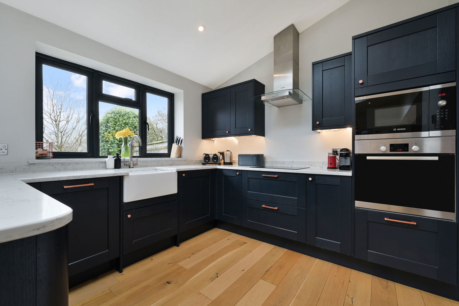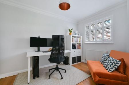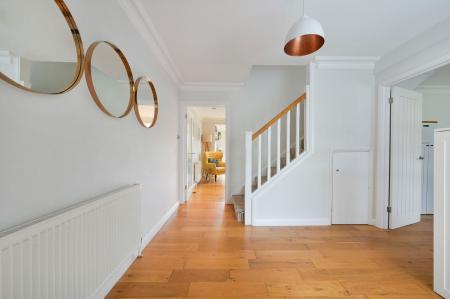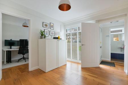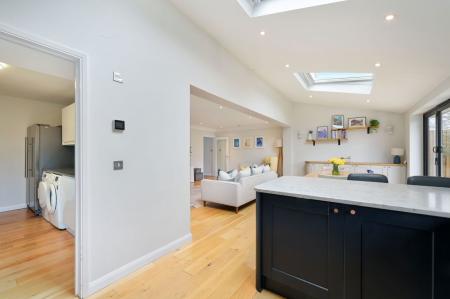 Stepping into this family home you have the benefit of a handy porch area to take your shoes off with a modern downstairs cloakroom. The bright entrance hall with wooden flooring is light and welcoming and leads you to the cleverly reconfigured downstairs accommodation to create an expansive kitchen/dining/living area. Featuring a modern kitchen with integrated appliances, Bosch eye level oven and microwave, dishwasher, lovely quartz worktops, and a large island, perfect for entertaining. Natural light floods the space through bi-fold doors and the two sky lights, seamlessly connecting the indoors with the garden. A separate reception/ office room to the front provides a cosy retreat. The utility room off the kitchen provides ample space with a mix of storage cupboards and provides space for a washing machine, dryer and fridge/freezer. This leads to the converted garage area which is suitable for storage only with power and light.