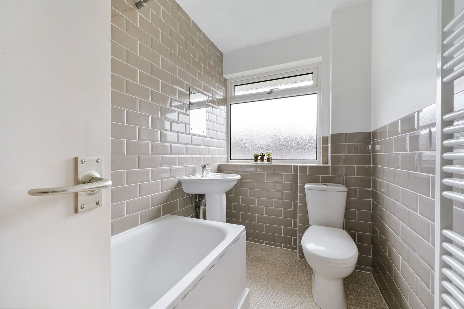 - Bathroom with clean, neutral finishes