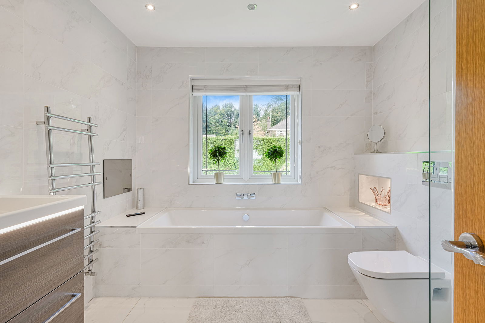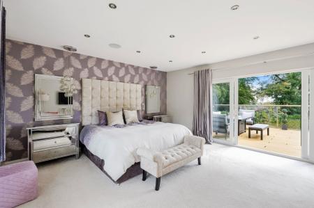 Upstairs, the galleried landing enjoys far-reaching views towards the Ashdown Forest and leads to four generous double bedrooms, two with en-suites, plus a luxurious family bathroom. The primary suite is a sanctuary in itself — featuring a sun-drenched terrace, bespoke dressing room, and a spa-style ensuite complete with deep soaking bath, rainfall shower, and integrated TV.