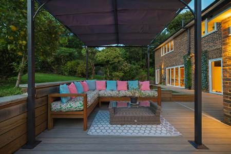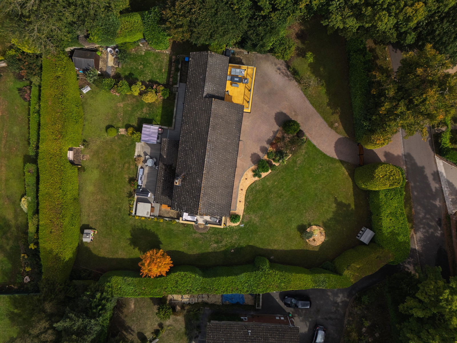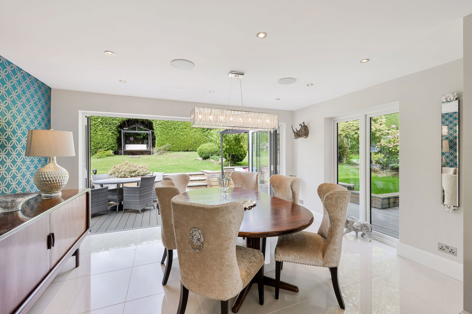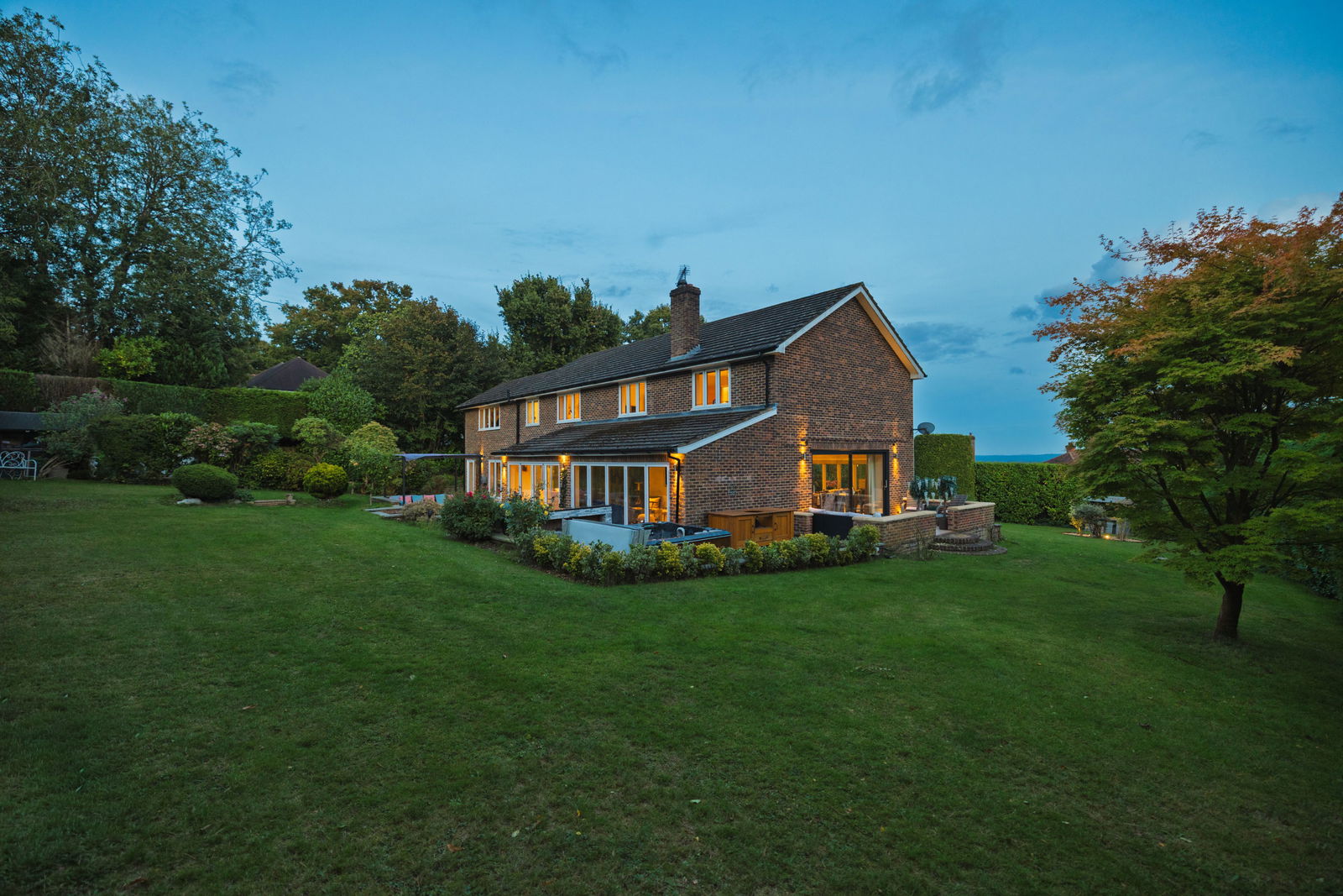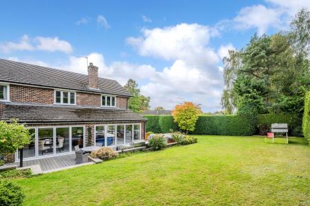 The beautifully landscaped wraparound garden is designed for both relaxation and fun. A large terrace with outdoor kitchen area is perfect for summer dining, while mature trees and hedges offer complete privacy. Expansive lawns create an idyllic backdrop for children to play and families to unwind.