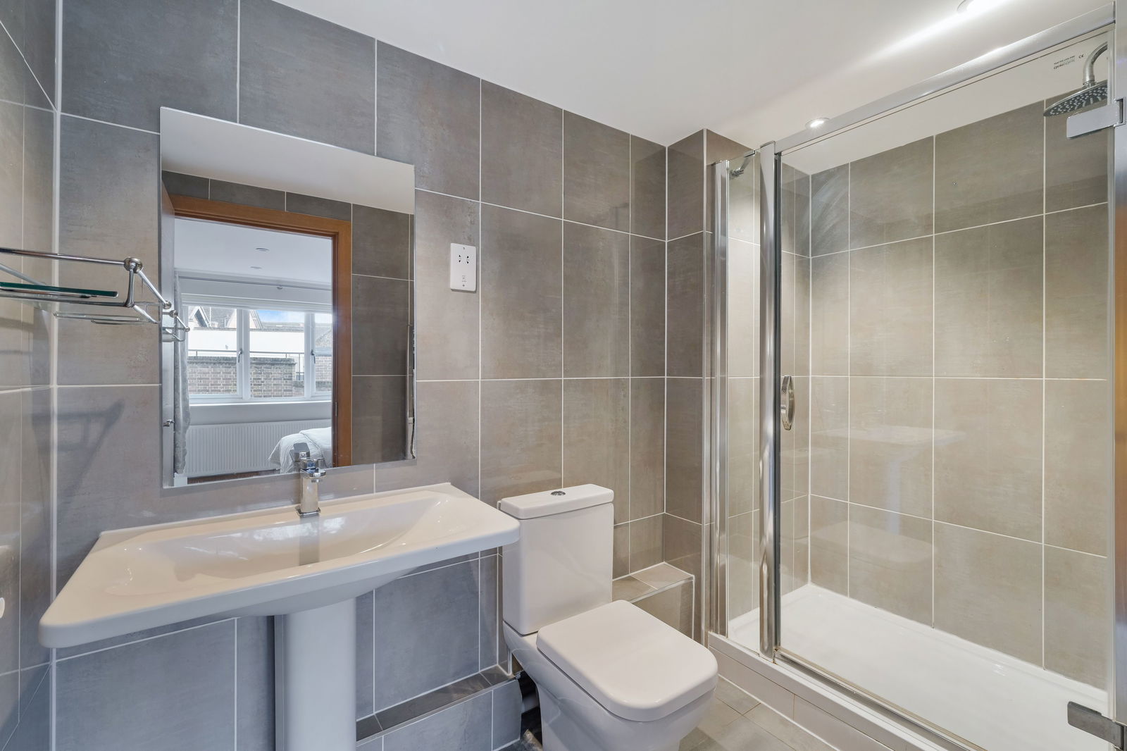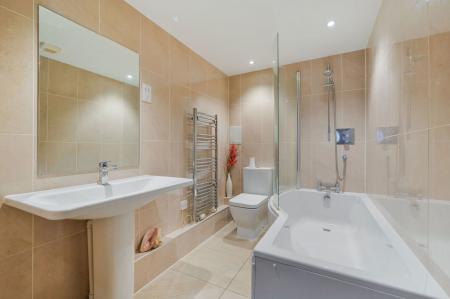 An inner hallway leads to three well-proportioned bedrooms. The principal bedroom benefits from built-in wardrobes and a stylish en-suite shower room with large shower cubicle and chrome heated towel rail. Bedroom two is a further generous double with built-in wardrobes, while bedroom three offers versatility as a guest room, nursery or home office. The family bathroom is fitted with a white suite comprising enclosed bath with shower over, wash basin and low level WC, finished with fully tiled walls and flooring.