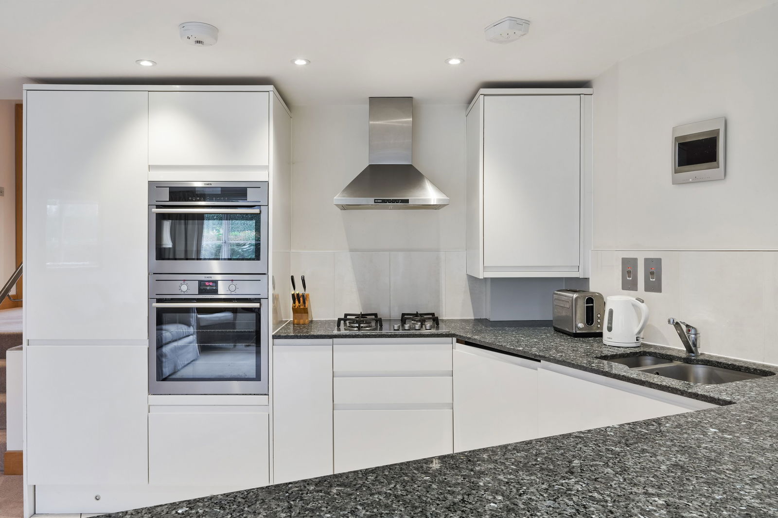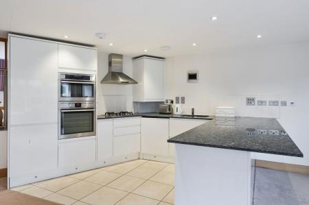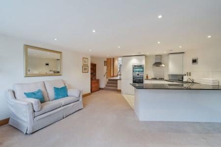 The apartment opens into a welcoming entrance hall with cloakroom, leading through to an impressive open plan kitchen/living/dining room. The kitchen is fitted with an extensive range of contemporary units complemented by granite worktops and integrated appliances including AEG dishwasher, AEG washer dryer, four ring gas hob with extractor over, double oven and integrated fridge freezer, together with a cupboard housing the Vaillant gas central heating boiler. The living area enjoys a large front aspect window and door opening onto a private seating area, creating a bright and sociable living space ideal for both relaxing and entertaining.