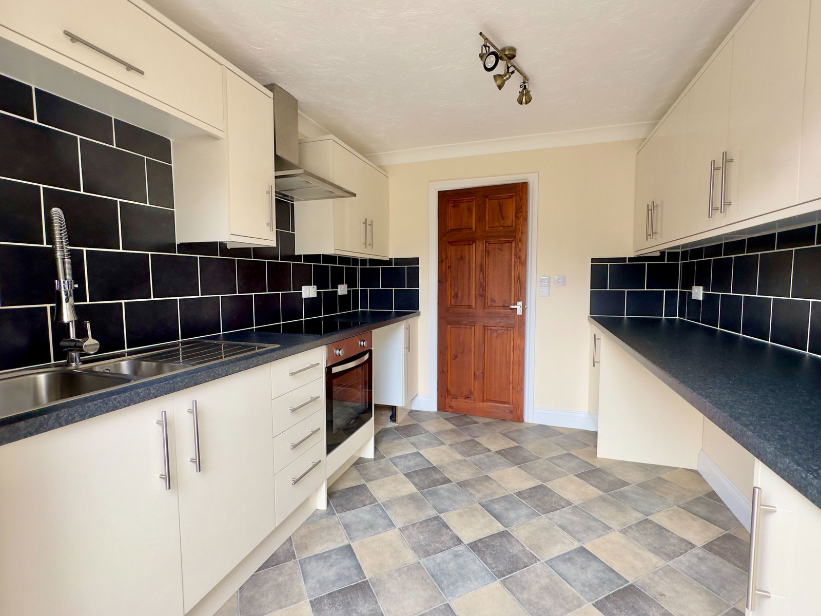 KITCHEN - 3.02m x 2.60m - Single aspect room with French doors providing access to rear Patio Garden. Stainless steel one and a half bowl single drainer sink, inset electric oven with four ring hob and extractor hood over, space and plumbing for dishwasher or washing machine, breakfast bar with cupboard to side and cupboards over, laminated work surface with tiled surround, six power points, thermostatic heating control, ceiling light.