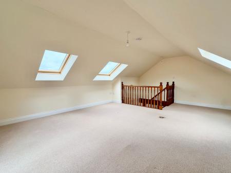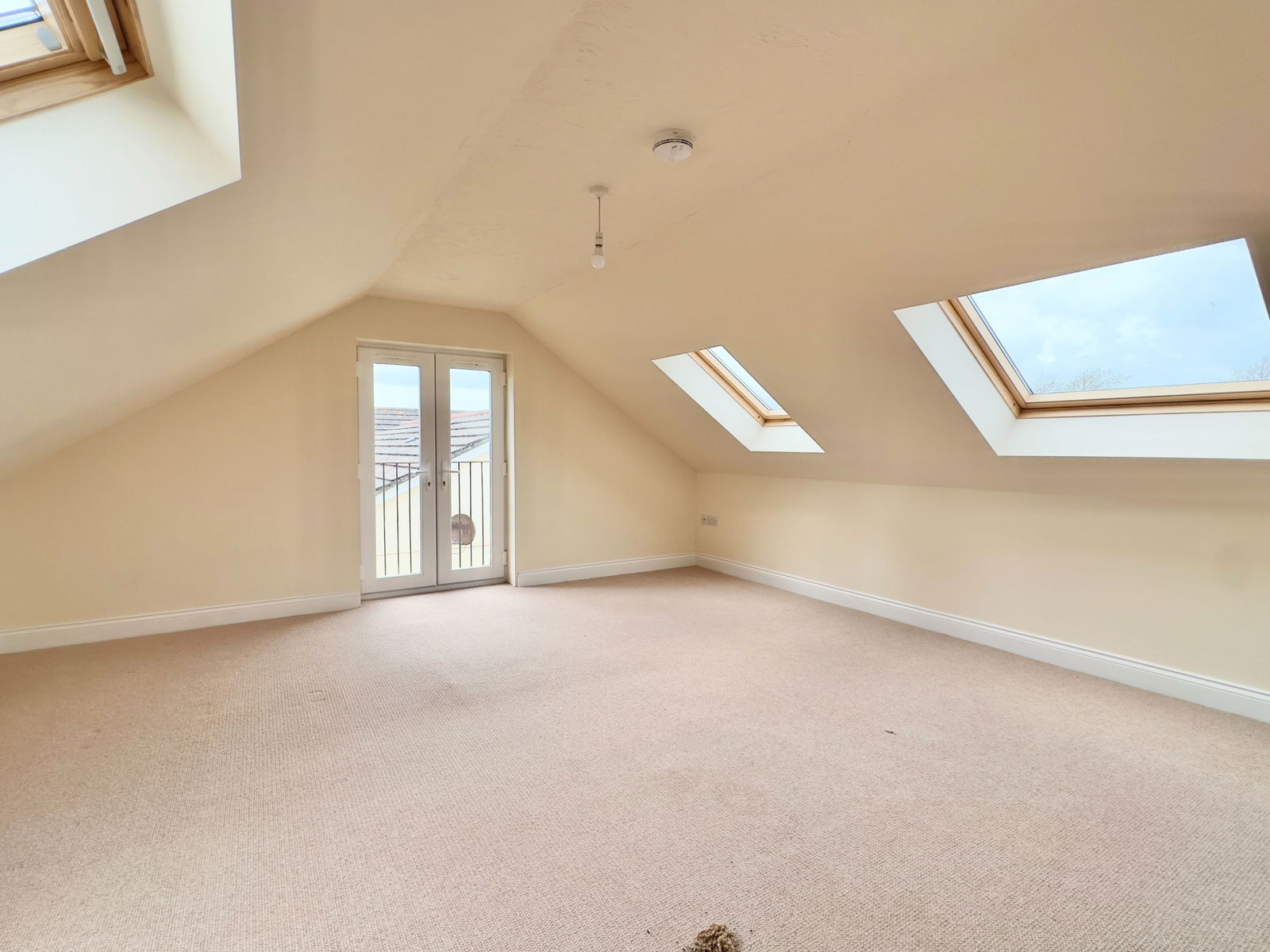 LIVING ROOM - 6.34m x 4.97m - French doors to gable end with Juliet balcony, three Velux roof lights, ten power points, TV point, heat store panel heater with Thermostatic heating control, centre ceiling light.