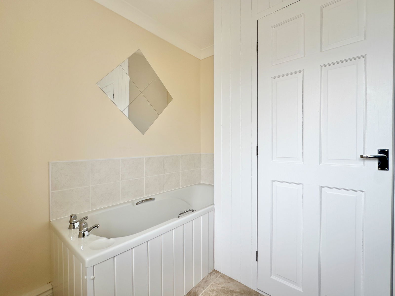 FAMILY BATHROOM - 3.40m x 1.25m plus 1.83m x 1.46m plus 0.70m x 0.69m - Bathroom suite comprising panel bath separate corner shower with electric Mira Jump shower, low level WC, pedestal wash hand basin, built in cupboard housing Santon pressurised hot water system.
