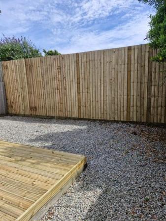 REAR GARDEN - 8.5m x 5.5m - Timer decked Patio with low maintenance chippings and bounded by a timber fence.
