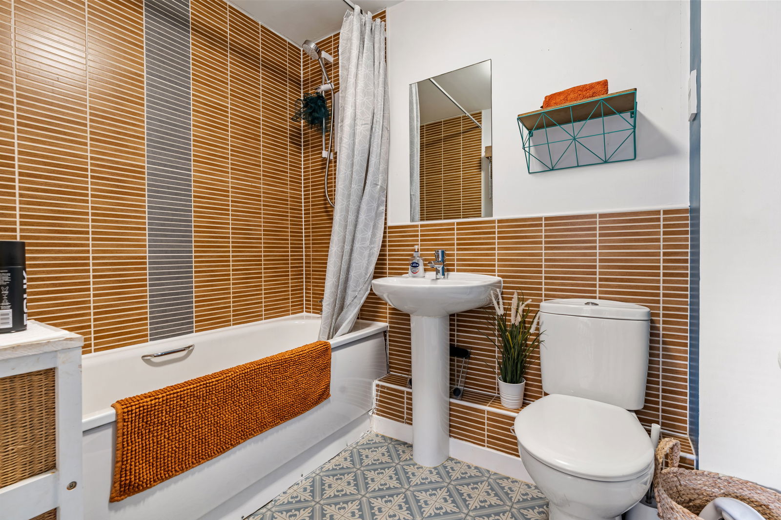 Panelled bath with electric shower over, low flush WC and pedestal wash hand basin, radiator, extractor fan.