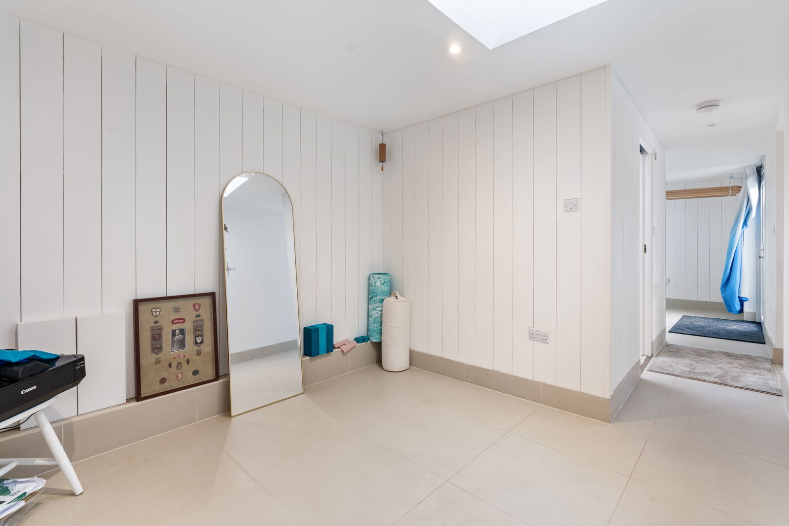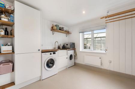 Single aspect room with personal door providing access to the rear garden. Butler sink, space and plumbing for washing machine and tumble dryer with hardwood worksurface over, storage cupboards with shelving and display shelves, power point, recessed ceiling lights, panelled walls, panel heater.