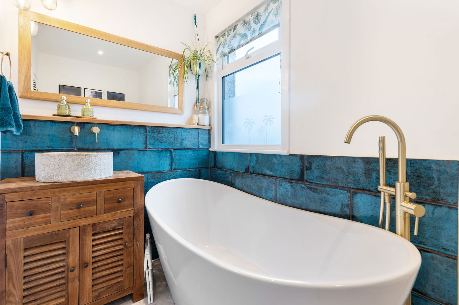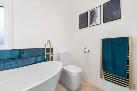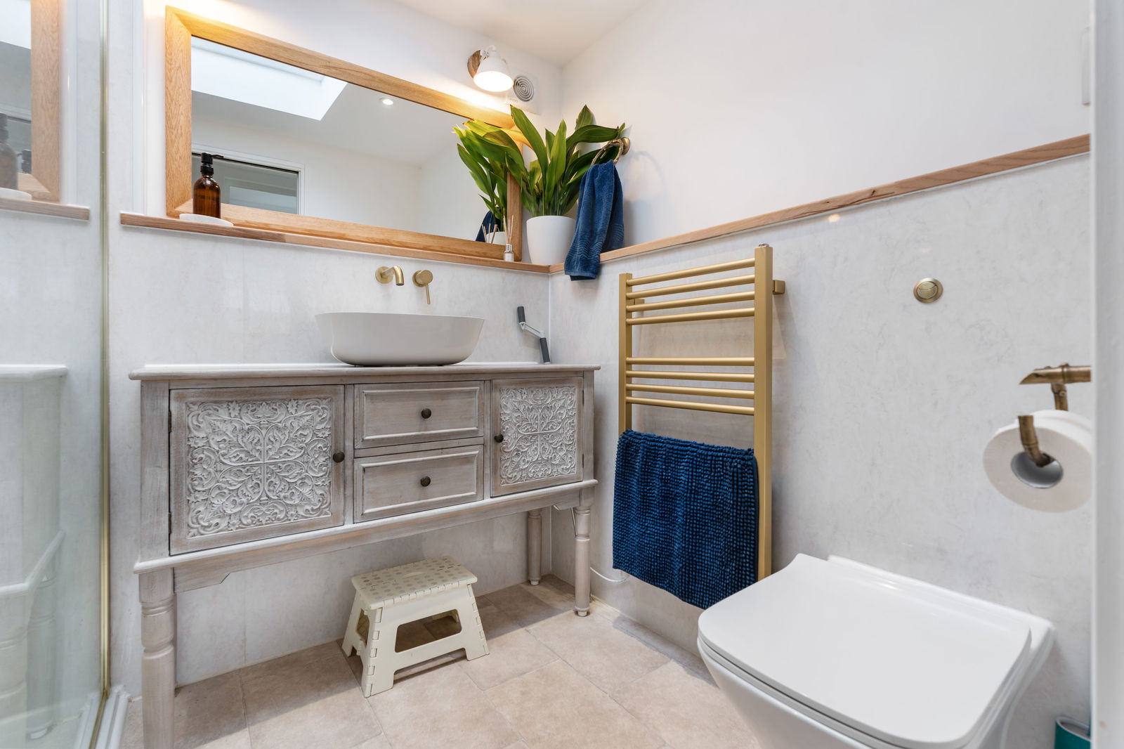 Contemporary bathroom suite with feature bath and wash hand basin, low level WC, partially tiled walls, ladder rack towel rail, built in cupboard housing pressurised hot water system.