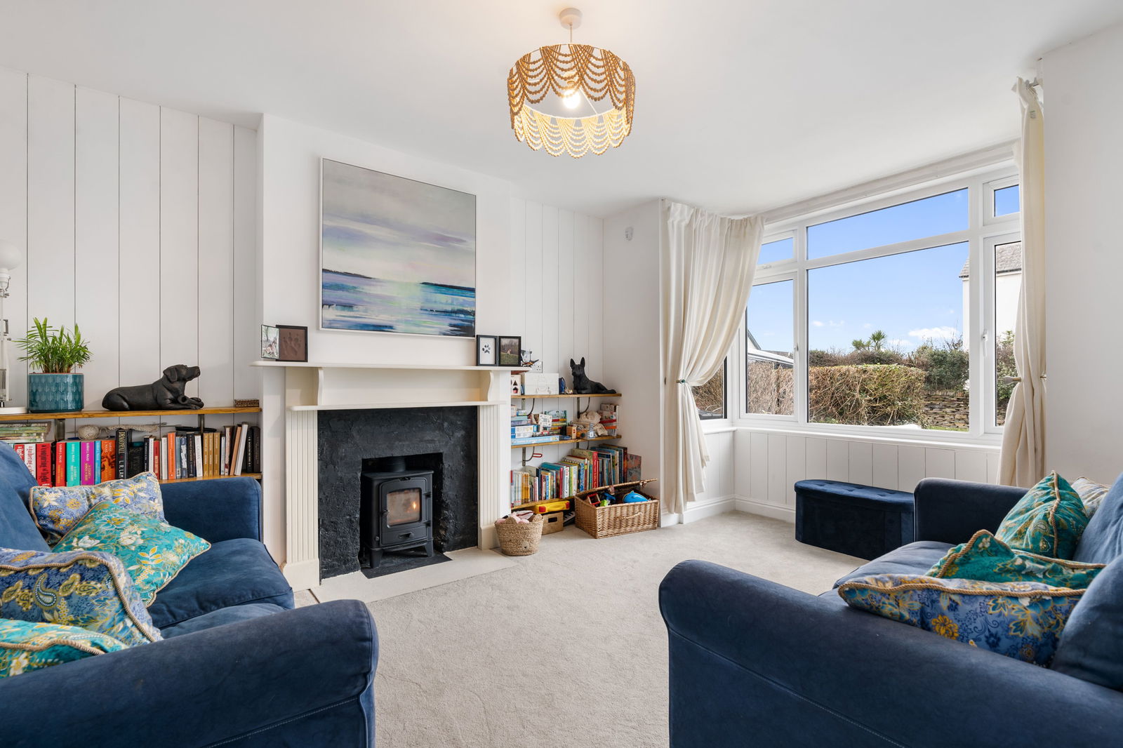 Bay window overlooks the front elevation. Feature fireplace with wood burning stove, power point, centre ceiling light, panel heater, feature panelled wall.