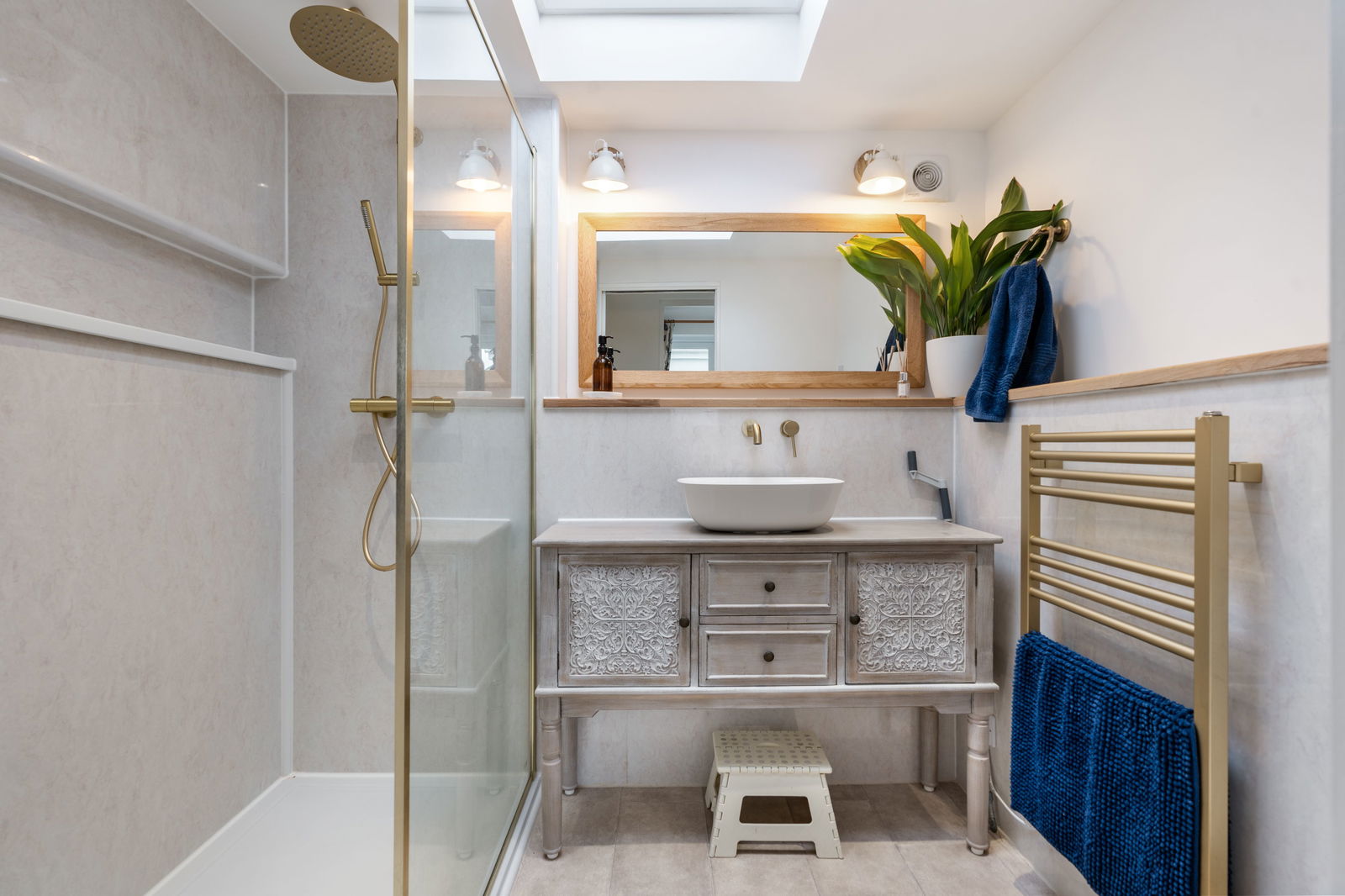 Large walk in shower, feature wash hand basin set onto attractive base unit, concealed cistern low level WC, wall light points, extractor fan, recessed ceiling lights, roof light.