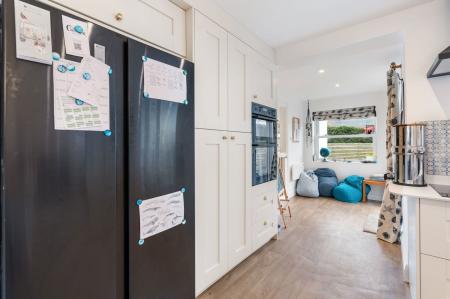 With window to the rear and French doors providing access to the rear garden. Feature inset wood burning stove with brick surround. Contemporary Kitchen comprising range of base and wall units with compact laminate worksurface over, integrated dishwasher, space for American fridge/freezer, further range of cupboards, integrated oven and grill with storage over, power point, recessed ceiling lights, stable door to entrance hallway, stable door to rear lobby which provides access to: