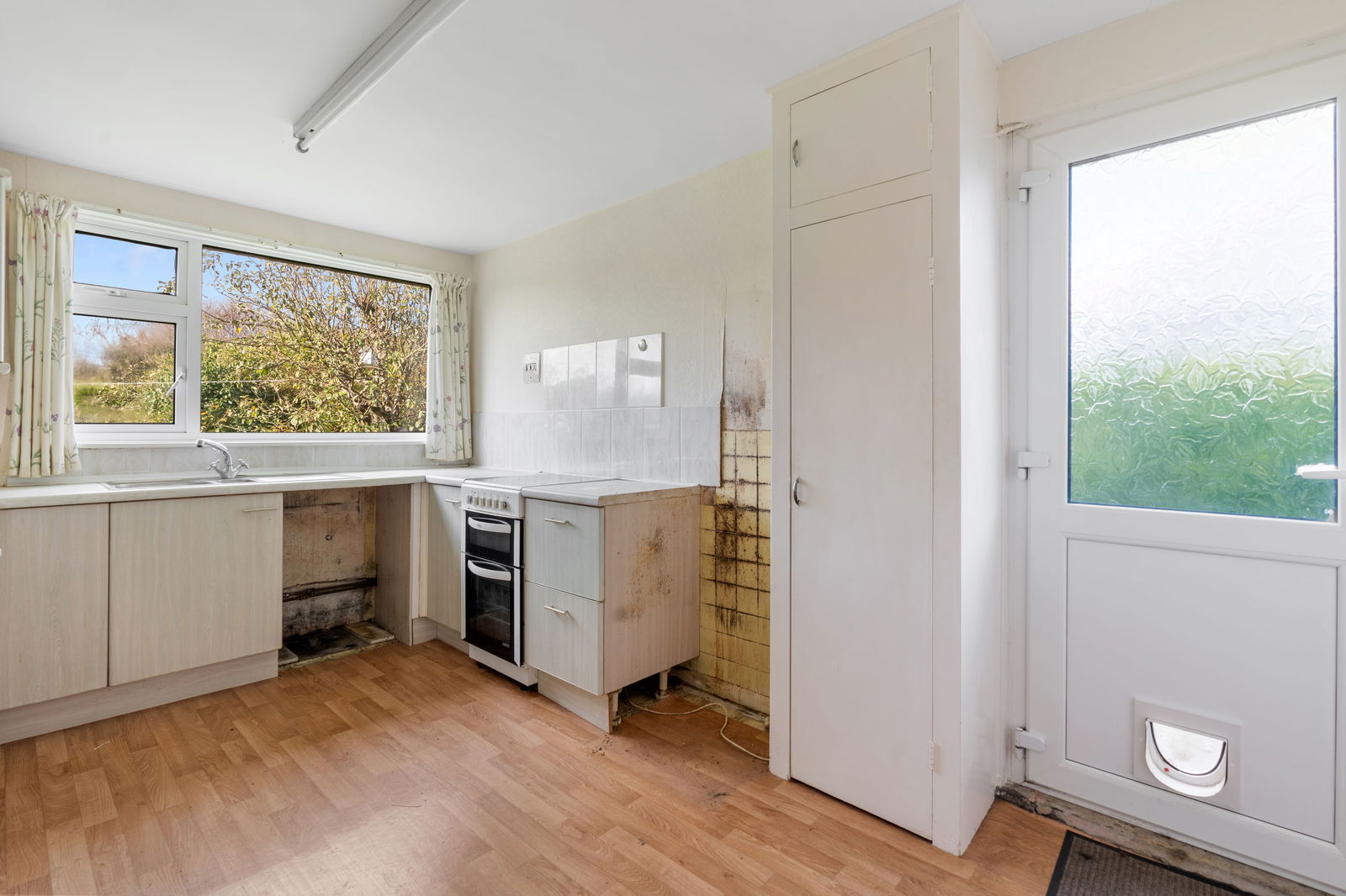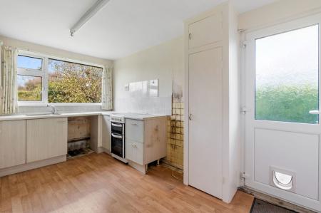 uPVC double glazed window overlooking rear garden, range of wall and base units with roll edged worktop and part tiled surround, 1 1/2 single stainless steel sink drainer, space for electric cooker, storage cupboard housing electricity consumer unit, part frosted glazed uPVC double glazed door opening to side elevation, laminate flooring, fluorescent ceiling light, power points.