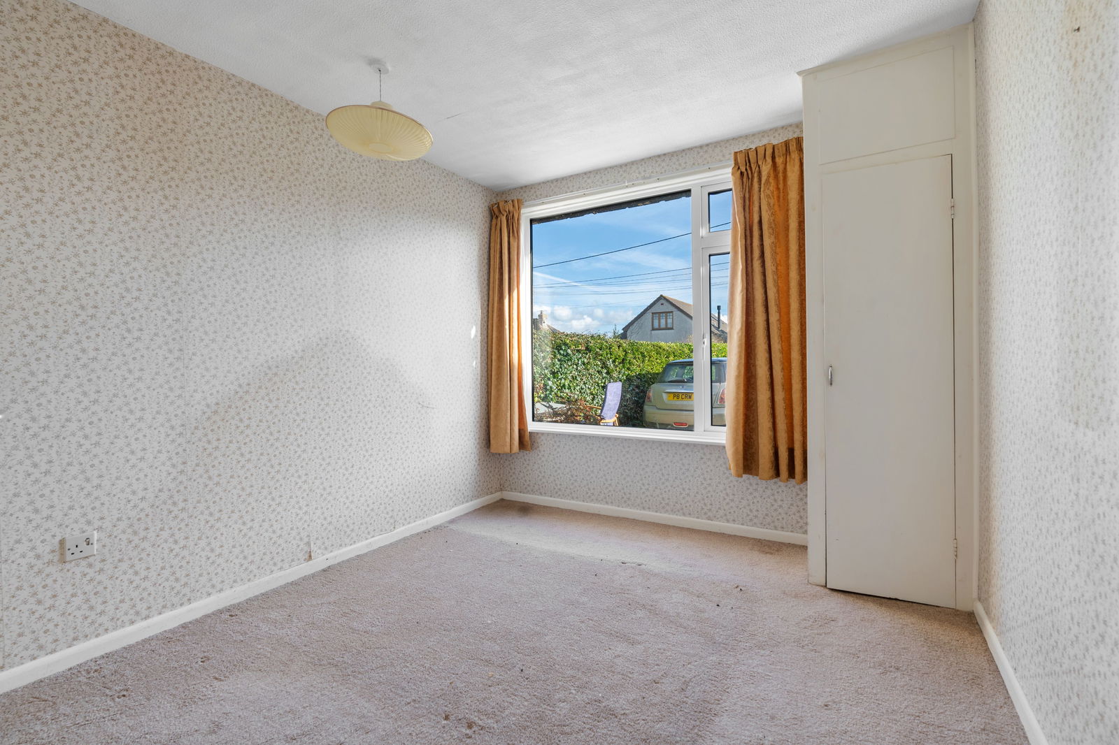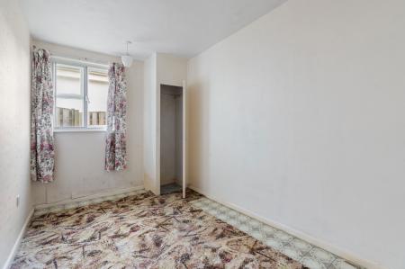 Single glazed window overlooking side elevation, built-in cupboard/wardrobe, centre two ceiling lights, power point.