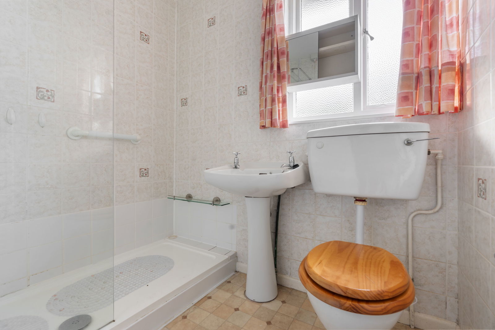 Single glazed frosted window, double size shower with Triton T80 electric shower with glazed screen to side, pedestal wash hand basin, low level WC, heated towel rail, fully tiled walls, ceiling light, vinyl flooring.