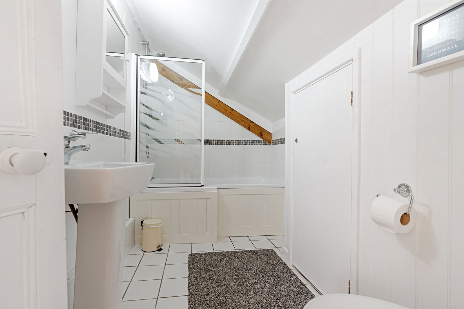 'P' shaped bath with shower over and glazed shower screen to side, pedestal wash hand basin, low level WC, ladder rack towel rail, extractor fan, wall light, under eaves storage.