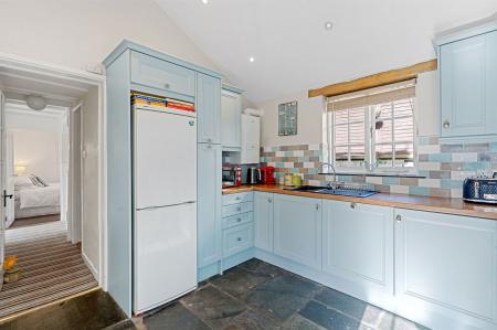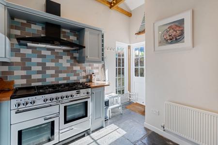 Triple aspect room with impressive vaulted ceiling. French doors with glazed panel to side and window to rear. Comprehensive range of base and wall units with laminated worksurface over, single drainer sink, space for Range oven with extractor hood over, integrated dishwasher, integrated washing machine, wall mounted gas fired central heating boiler, recess for tall fridge/freezer, central heating radiator, original slate floor.